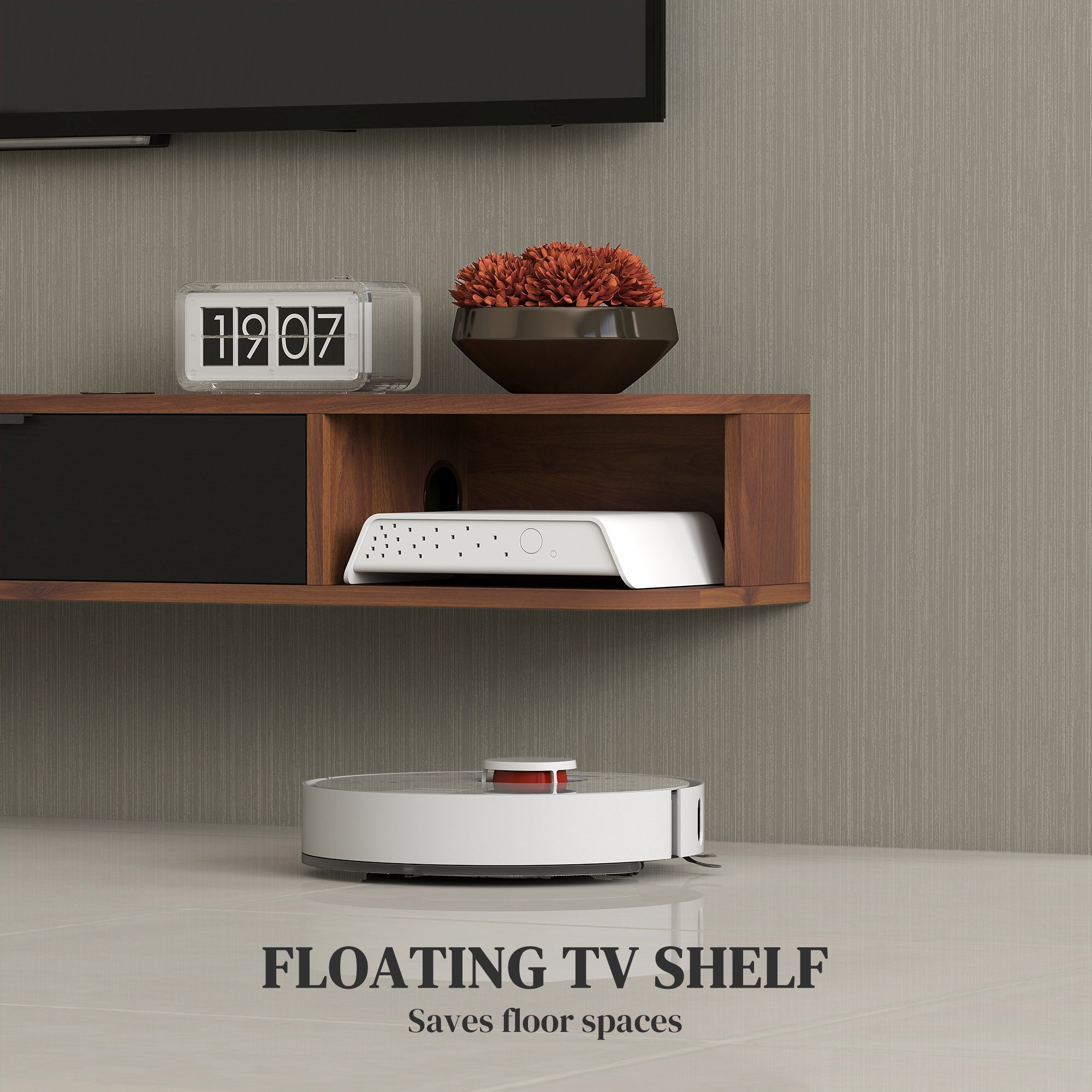 Comfort and design: Transform your living room into a modern, sleek, and soothing space with this contemporary wall-mounted TV stand. By freeing up floor space, it visually enlarges the room while creating a sense of lightness and order. Its warm walnut finish contrasted with black accents creates an elegant and timeless visual effect.