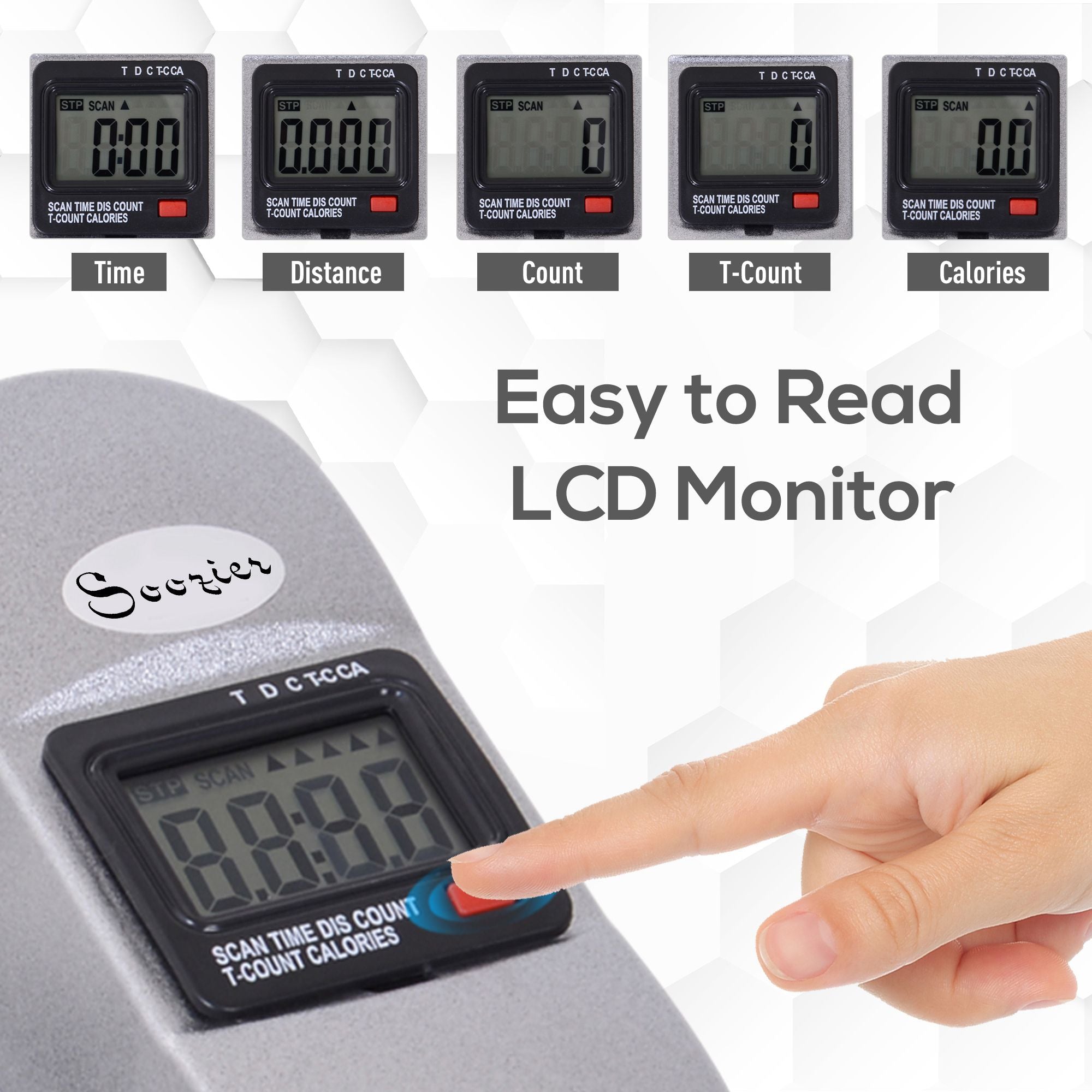 - LCD display shows time, speed, count, total and calories burned