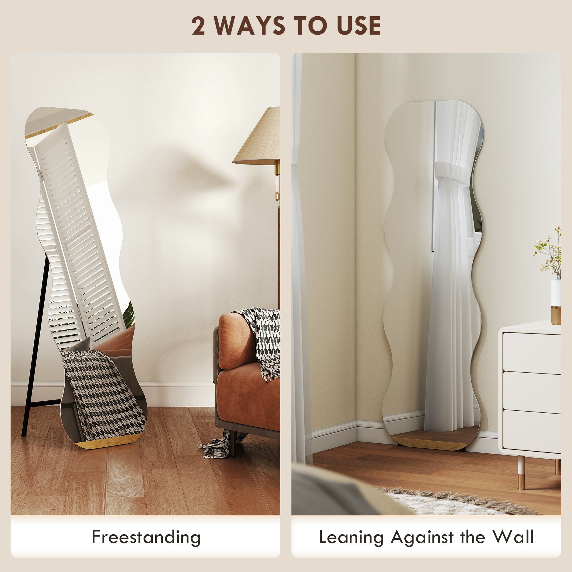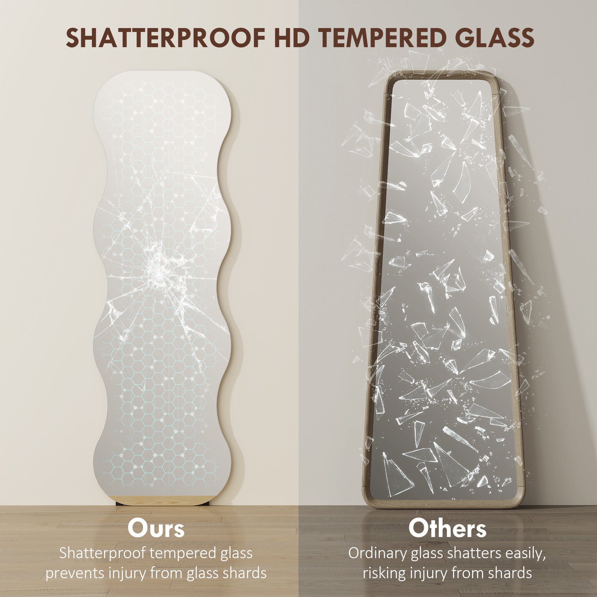 Safety and peace of mind: This large standing mirror is designed to withstand the daily grind of a busy home. Its shatterproof tempered glass protects against shards, making it safe to use in a bedroom, hallway, or bathroom.