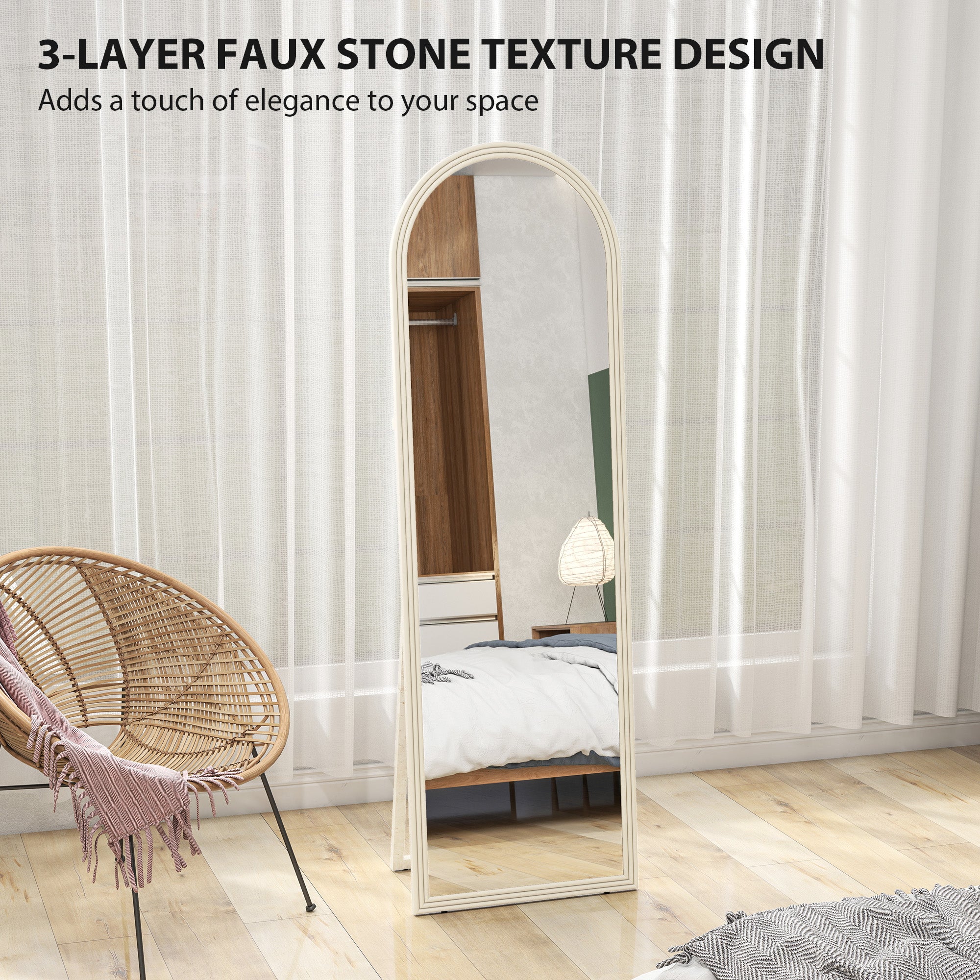 Elegance and serenity: this floor mirror combines refined design with maximum safety. Its arched stone-effect frame adds a sophisticated, modern touch while bringing warmth and texture to your home decor.