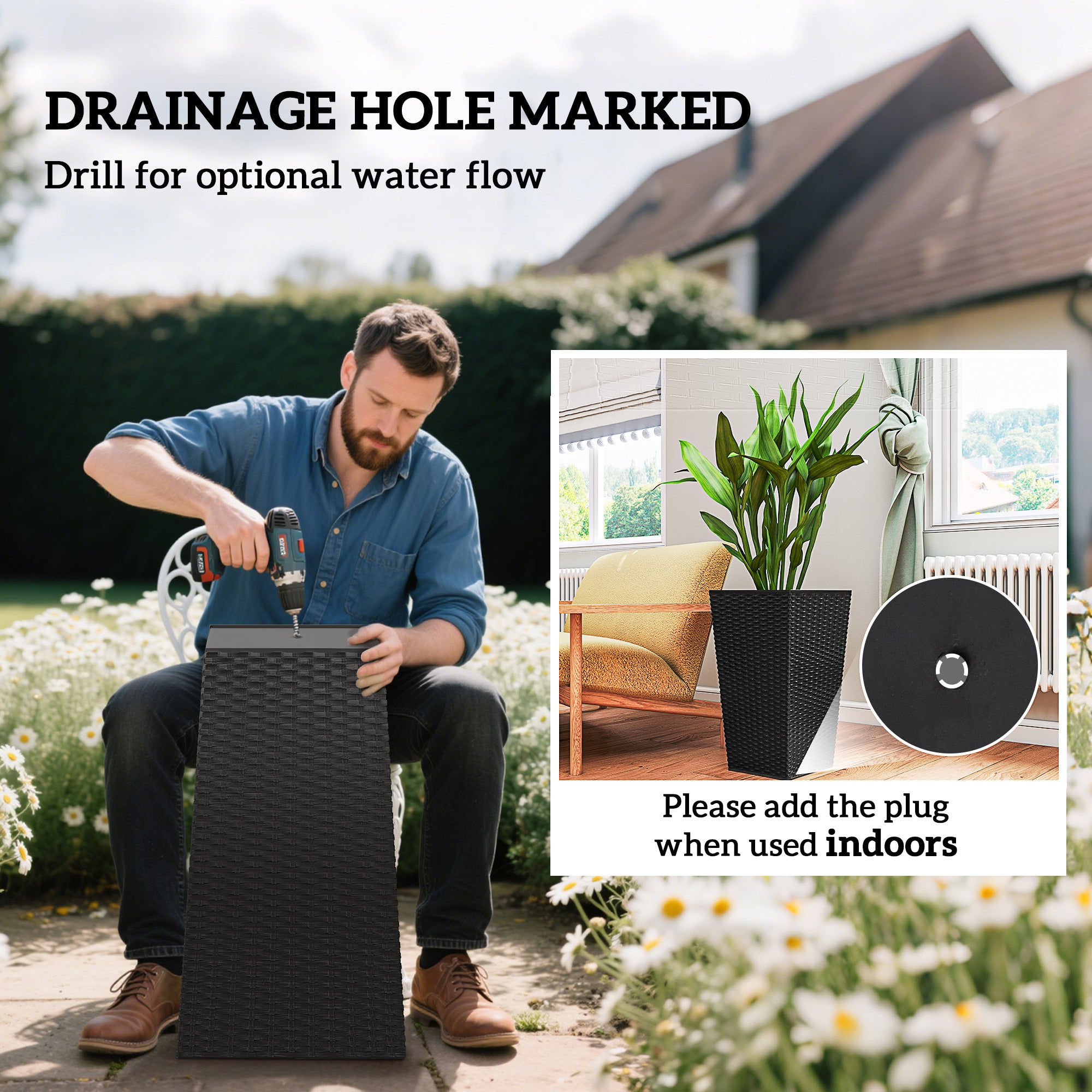 - • A drain hole with a plug at the bottom to prevent water from accumulating