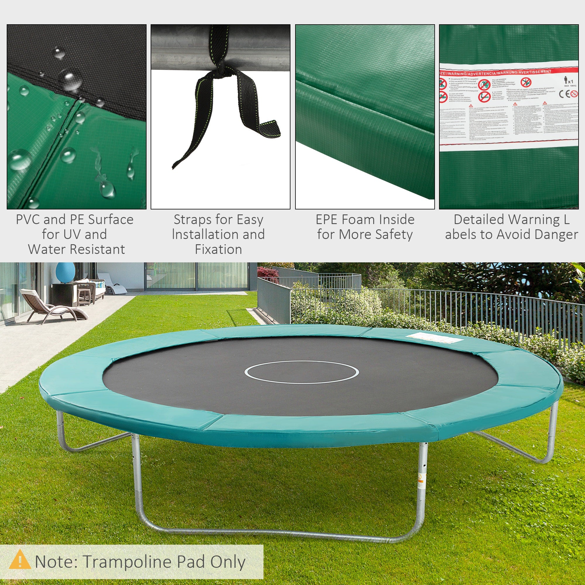 Safety, safety and safety!!Safety is so important for us no matter when we are working or having fun together. If your pads have shielded you for quite long and have been in torn or ruptured condition, substitute this safety pad with for the old product! It is able to give the maximum protection to the kids, teens or adults from being scratched or trapped by the spring hooks and space between springs. And the pad will not absorb water, mildew, crack or lose shape!