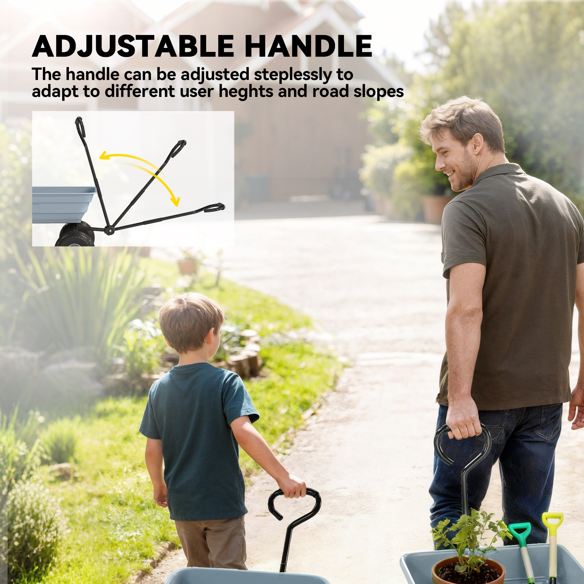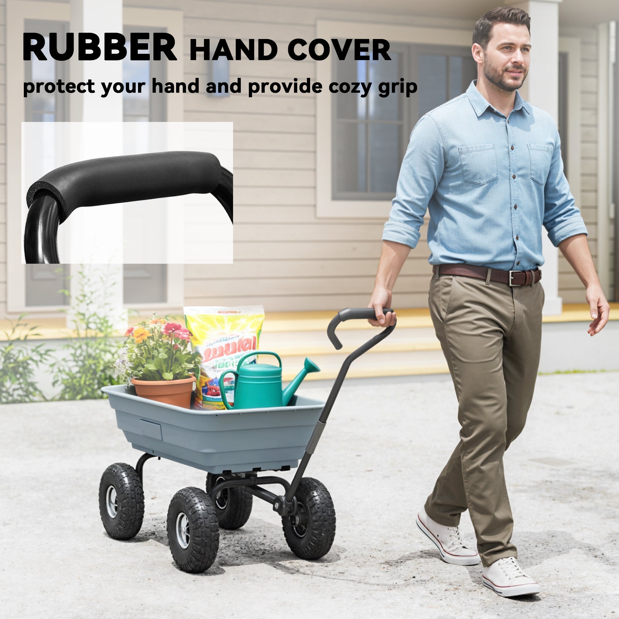 Tackle outdoor chores effortlessly with the [BRAND NAME] wagon cart! With a robust 551 lbs. capacity, this camping wagon easily hauls soil, leaves, and tools. The plastic bed tips for quick unloading, while the soft rubber handle and pneumatic wheels provide comfort and control. It's excellent for use as a camping cart or garden trolley!