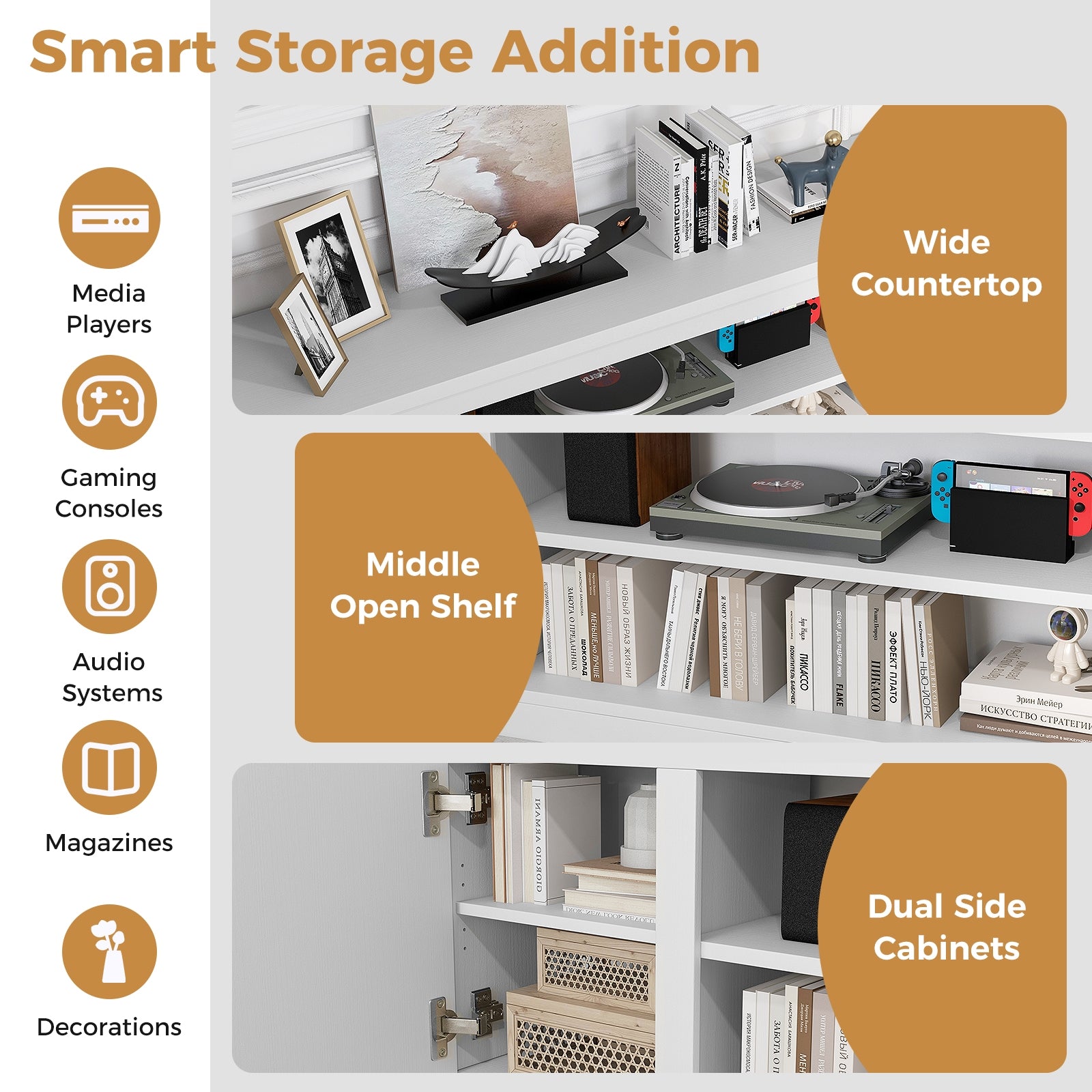 Versatile use: Thanks to its open central shelf and well-designed compartments, this piece of furniture allows you to easily arrange your multimedia devices, game consoles or decorative items, while keeping quick access to your essentials.