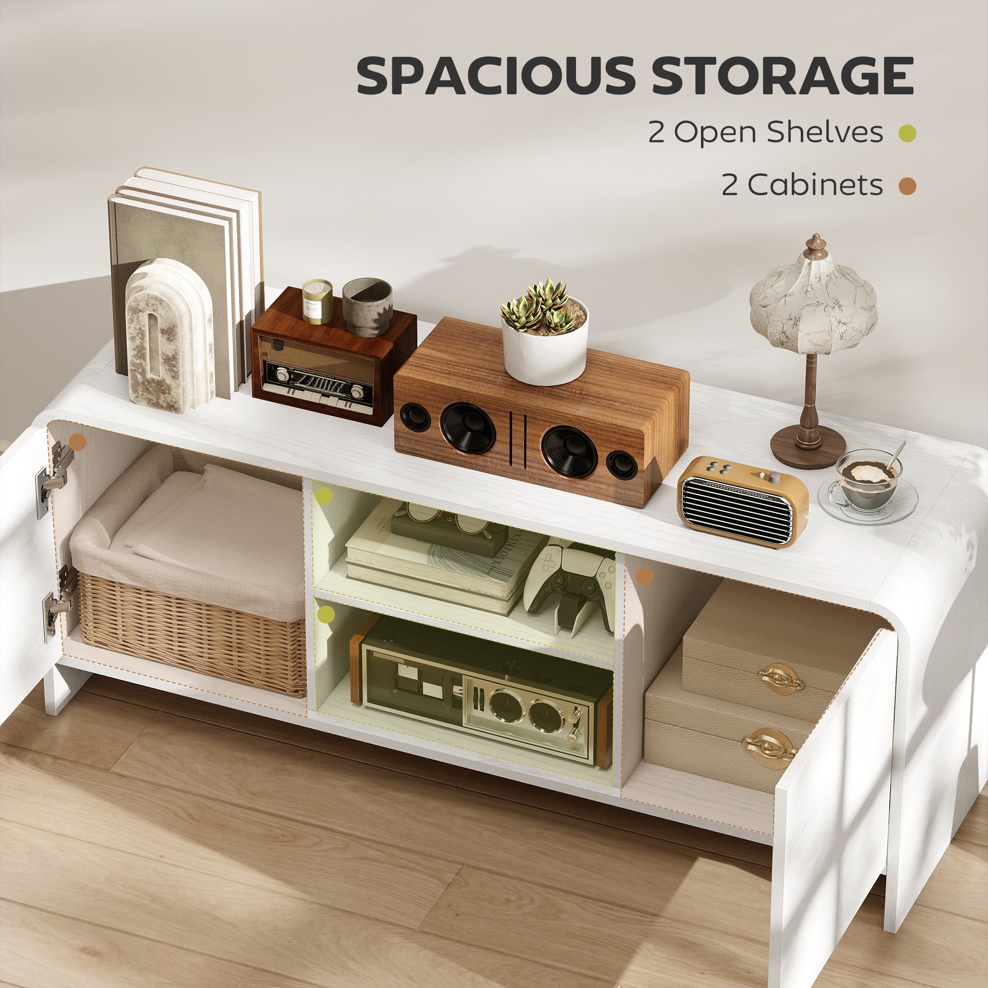 Designed to accommodate TVs up to 55 inches, this unit features a wide top surface, two open compartments, and two closed cabinets. It provides easy storage for game consoles, media devices, books, or decorative accessories, keeping your space neatly organized.