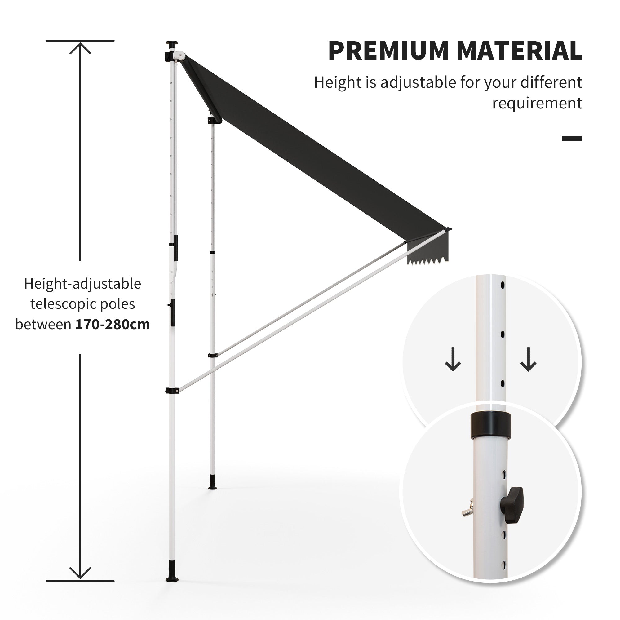 Idéal pour une installation devant une fenêtre, sur une terrasse, un balcon ou sous un porche, ce store banne rétractable s’adapte à différentes configurations. Les poteaux télescopiques réglables de 5,6 pi à 9,2 pi permettent d’ajuster la hauteur selon vos besoins, tandis que l’angle modulable assure un contrôle optimal de l’ensoleillement.