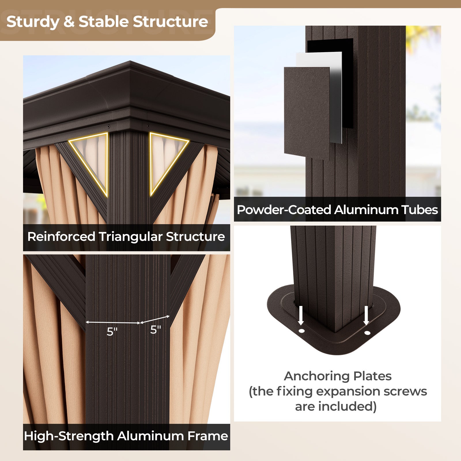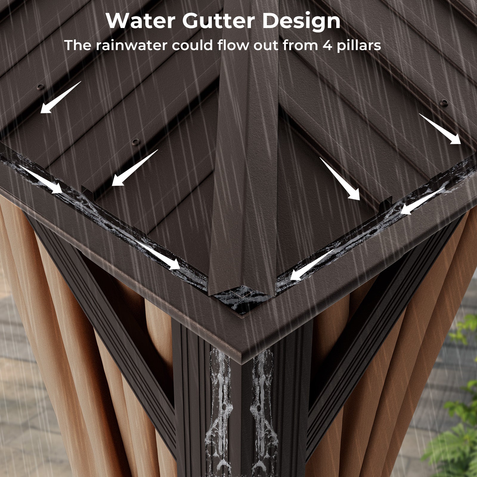 Le toit en acier galvanisé offre une protection solaire antirouille et imperméable, conçu pour résister aux intempéries toute l’année. Il est doté de gouttières intégrées et de quatre trous de drainage aux coins pour éviter l’accumulation d’eau. La structure en aluminium renforcée avec colonnes épaisses de 5" et supports triangulaires assure une stabilité exceptionnelle, même par vent soutenu.