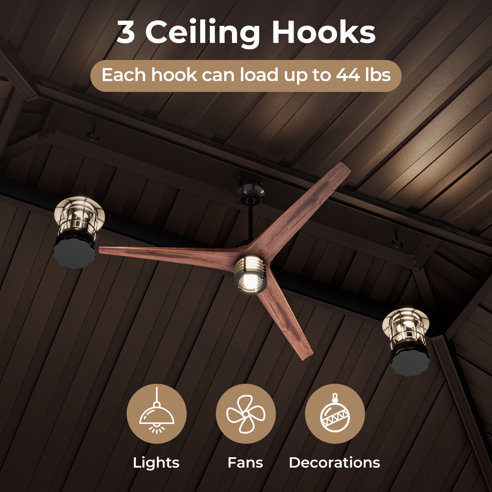 Le gazebo est équipé de rails doubles lisses permettant d’installer facilement les moustiquaires et les rideaux d’intimité. Les moustiquaires assurent une ventilation optimale tout en bloquant les insectes, tandis que les rideaux zippés offrent intimité et protection contre le vent et la poussière. Des crochets au plafond permettent de suspendre lumières, ventilateurs ou décorations. Le produit est livré en plusieurs boîtes pour un transport sécuritaire.