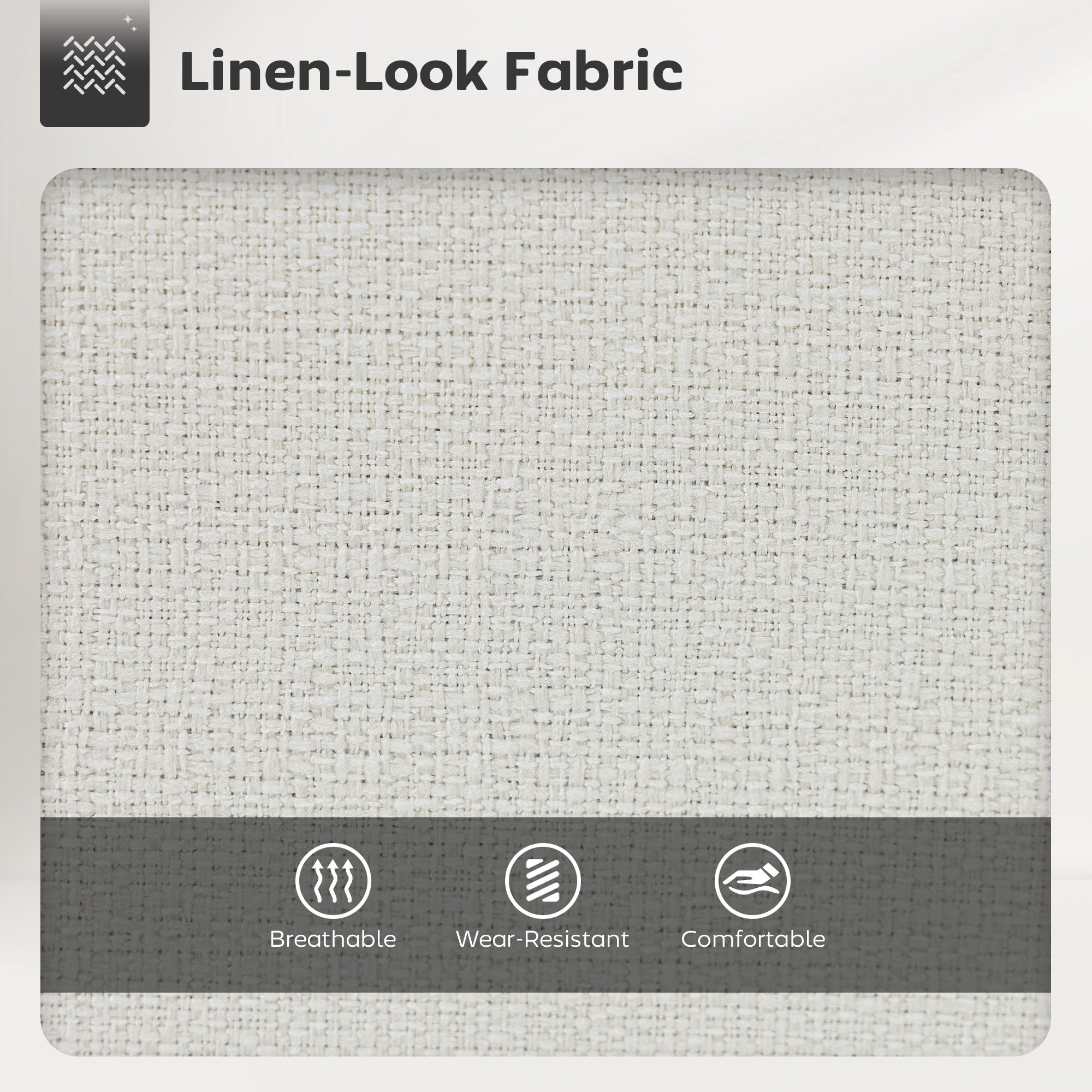 - Matériaux : Tissu effet lin (polyester), acier, mousse, contreplaqué