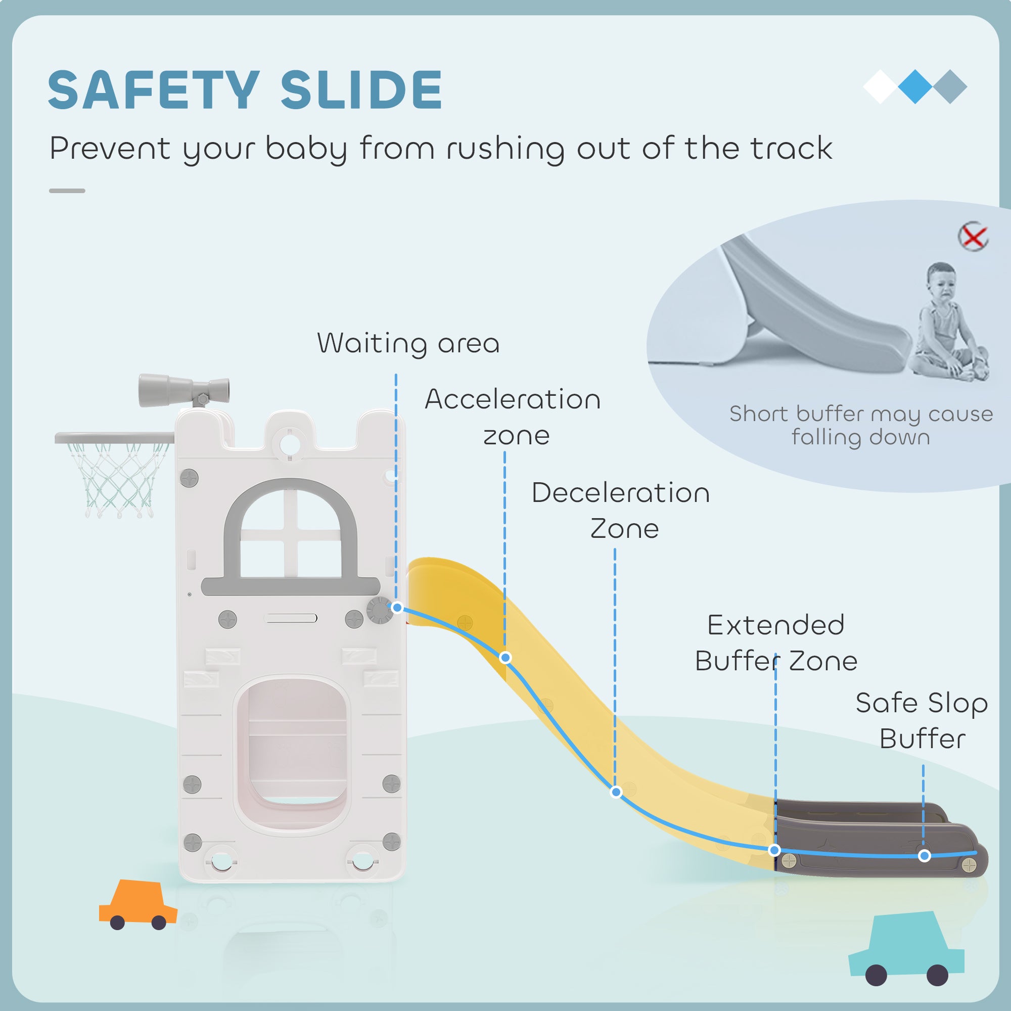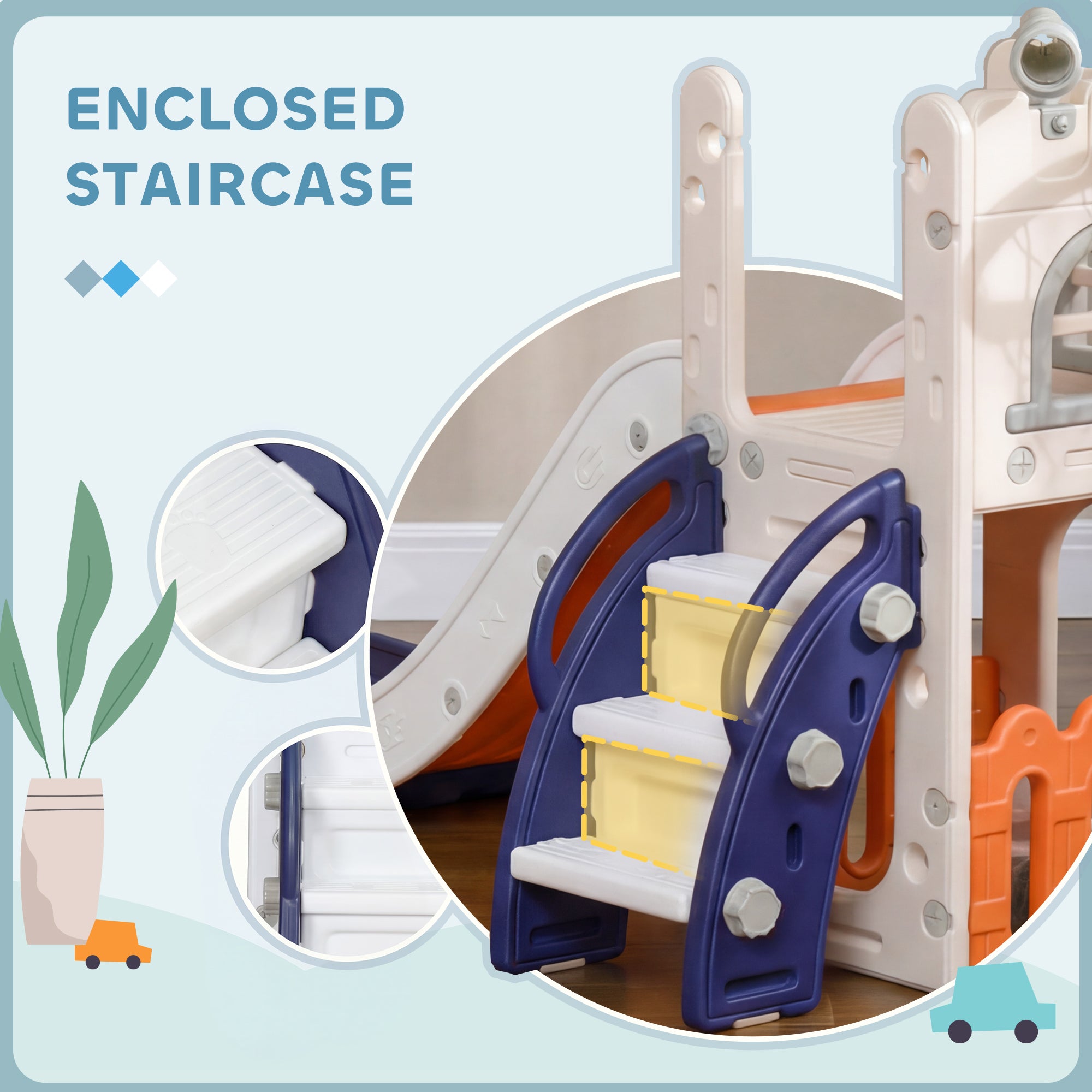 Cette structure ludique encourage l’activité physique et l’imagination des enfants. Les marches fermées avec texture antidérapante facilitent la montée, tandis que la zone d’accélération, la zone de décélération et la zone tampon assurent une descente douce et sécuritaire. Le panier de rangement intégré sous la glissoire permet de garder les jouets organisés et accessibles pendant le jeu.