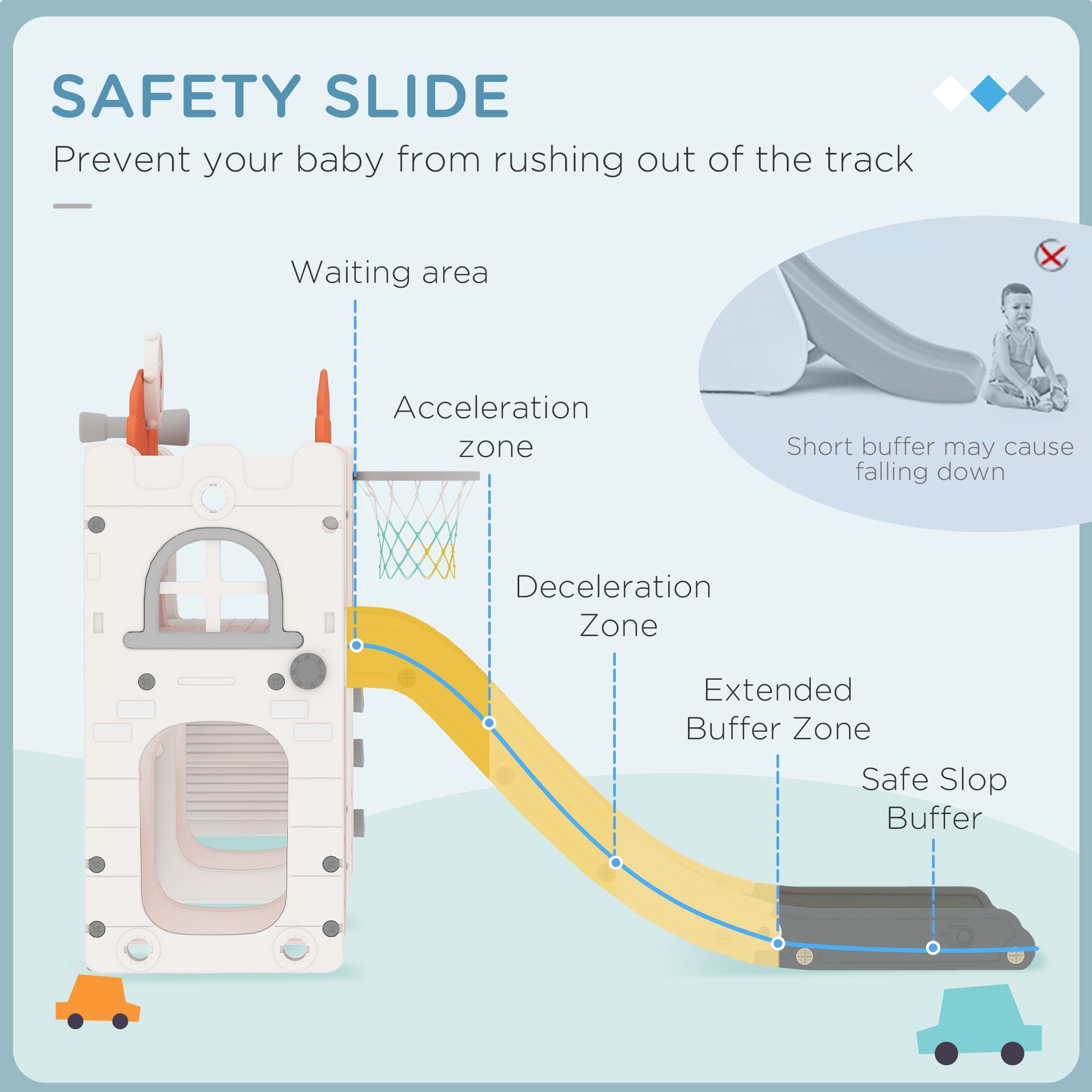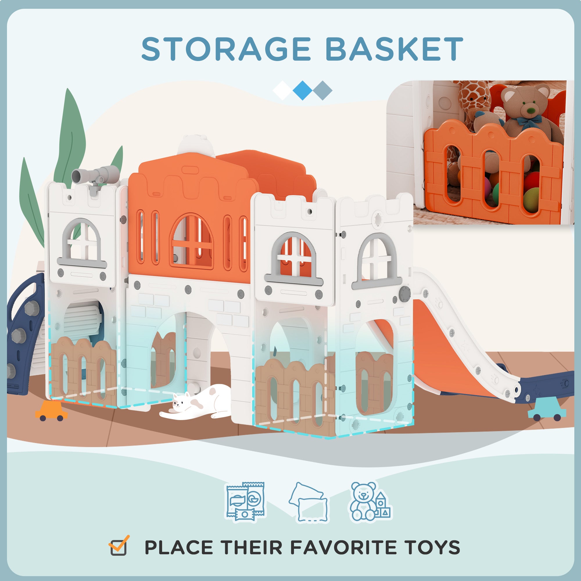 - Contient : 1 centre de jeu pour enfants, 1 glissoire, 1 tunnel, 1 panier de basketball, 1 télescope, 1 volant, 2 paniers de rangement, 1 mode d'emploi