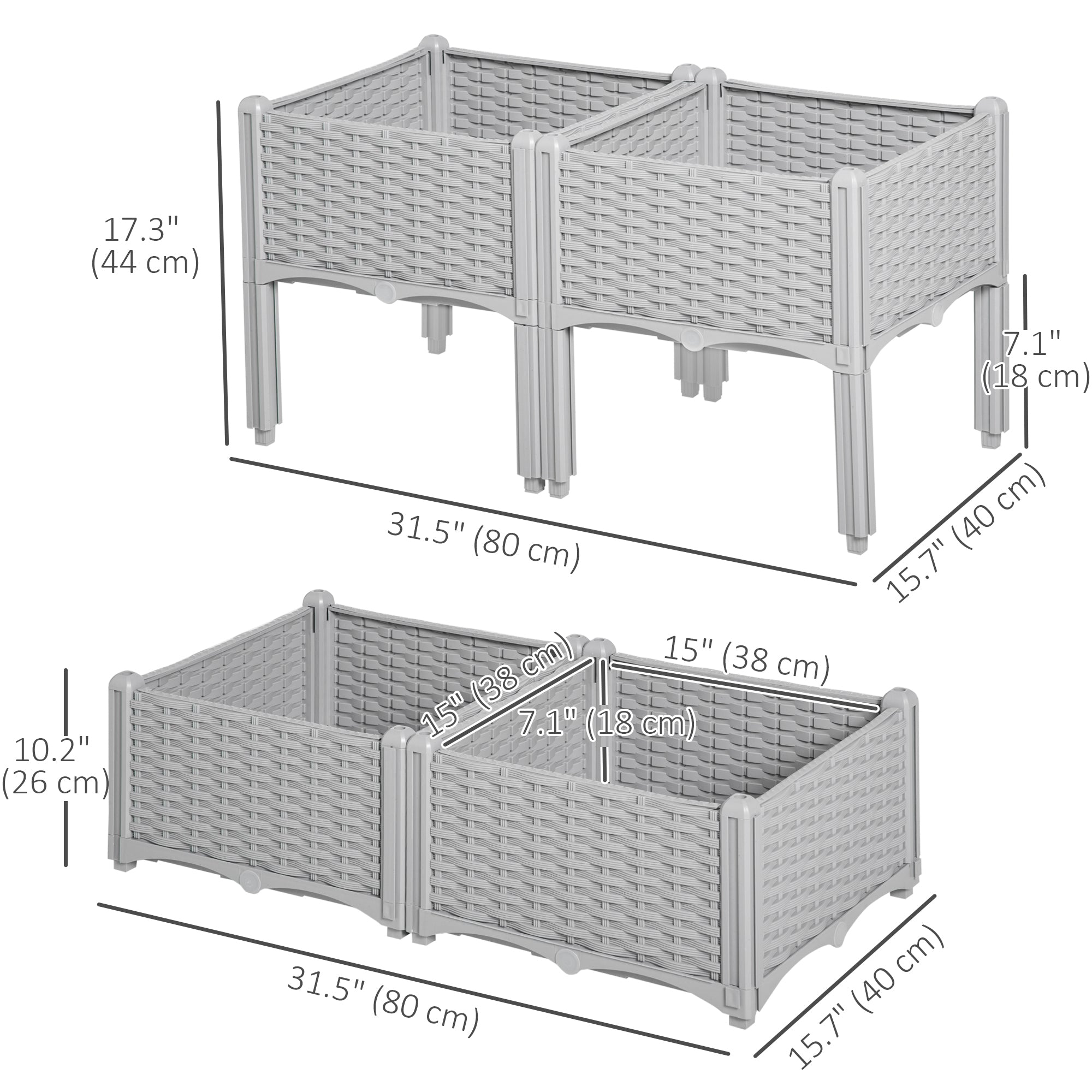 Fabriqués en polypropylène léger et résistant, ces bacs sont conçus pour supporter les conditions extérieures. Les trous de drainage intégrés favorisent une croissance saine des plantes en assurant une bonne évacuation de l’eau, tandis que la structure surélevée aide à protéger les plantations des insectes nuisibles.