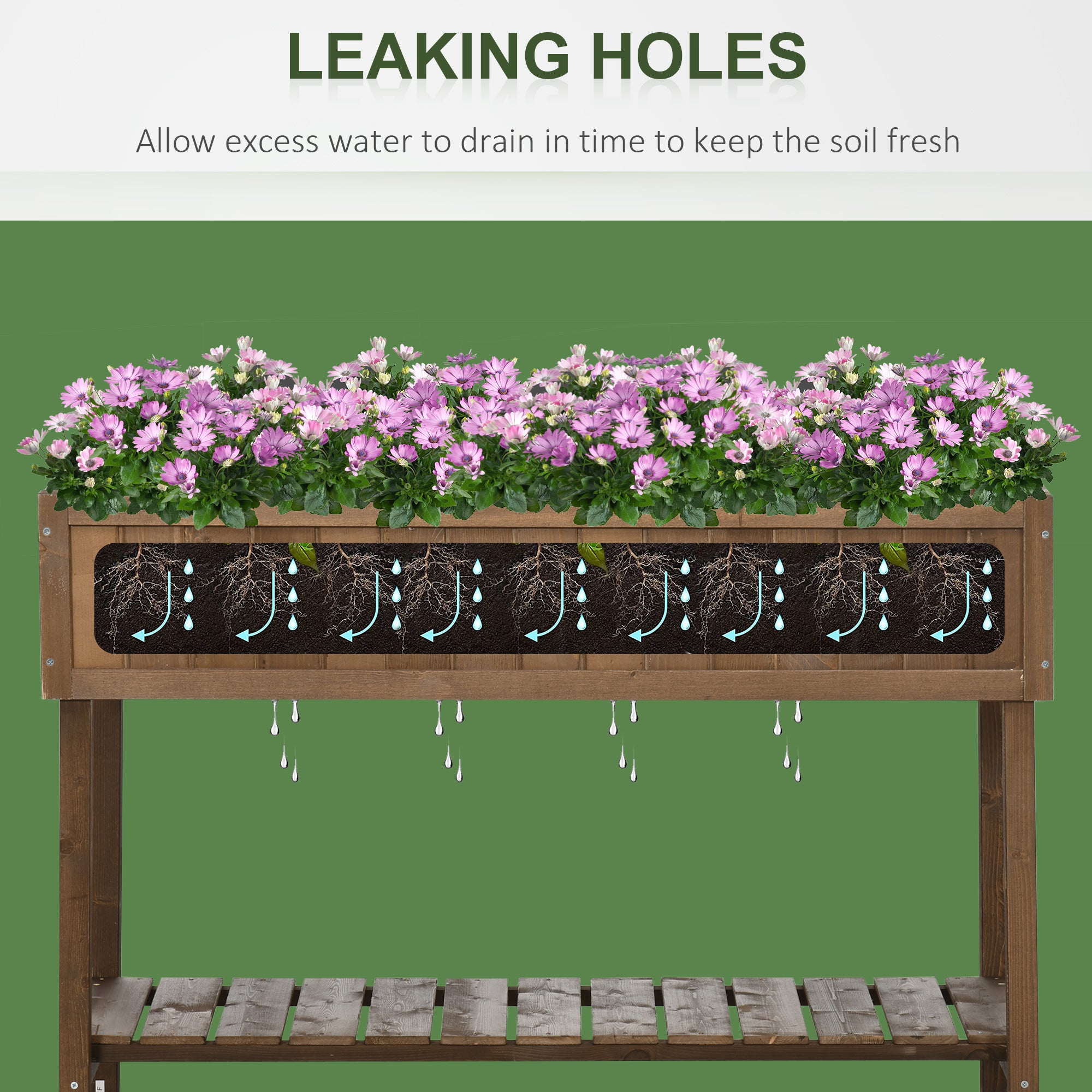 Fabriqué en bois de sapin massif, ce potager est conçu pour durer et peut être personnalisé avec la couleur de votre choix. Chaque compartiment est muni d’un trou de drainage afin d’évacuer l’excès d’eau et de favoriser une croissance saine des plantes.