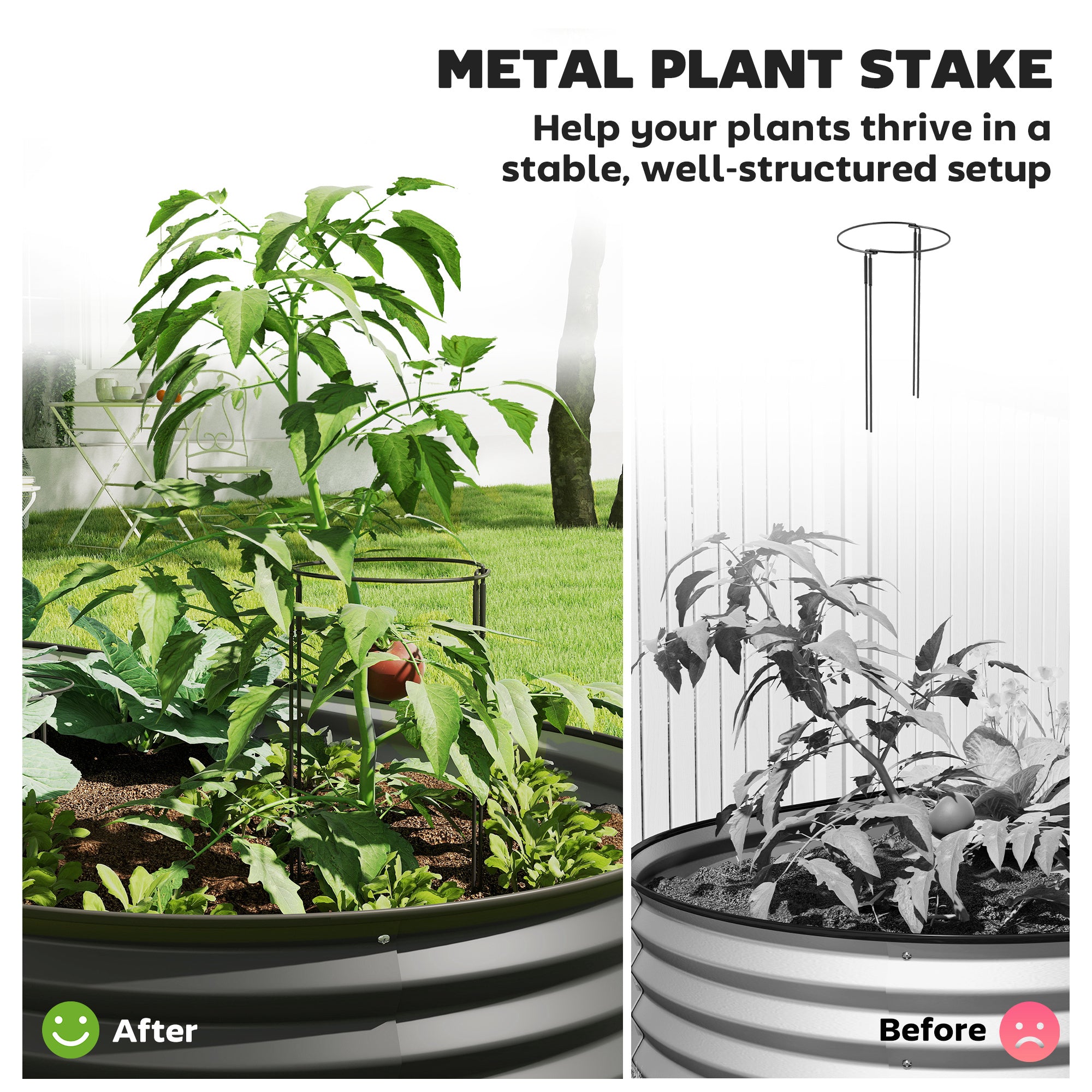 Grâce à sa conception à fond ouvert, les racines peuvent se développer librement dans le sol, favorisant une croissance saine et vigoureuse. Le tuteur métallique inclus soutient efficacement les plantes plus hautes, ce qui le rend idéal pour les fleurs, légumes et plantes grimpantes.