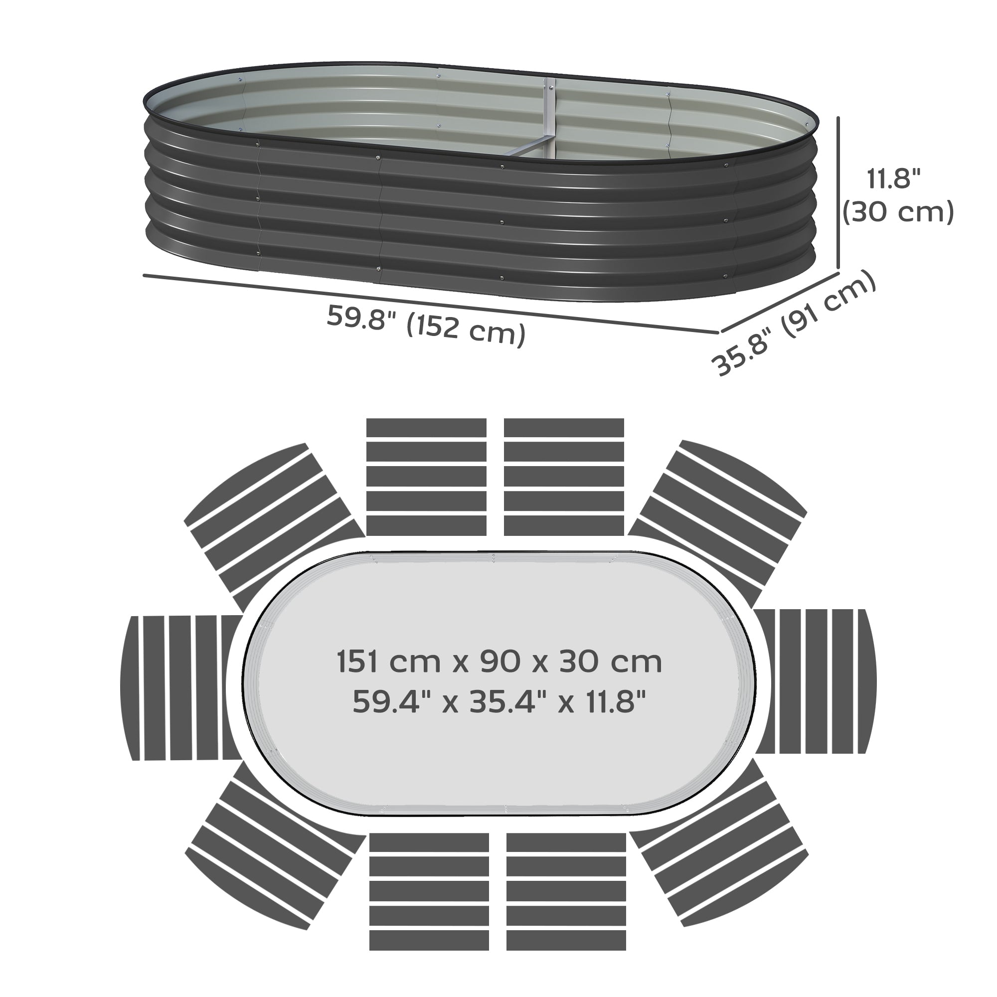 - Dimensions intérieures du pot : 59,4 po L x 35,4 po P x 11,8 po H (151 x 90 x 30 cm)