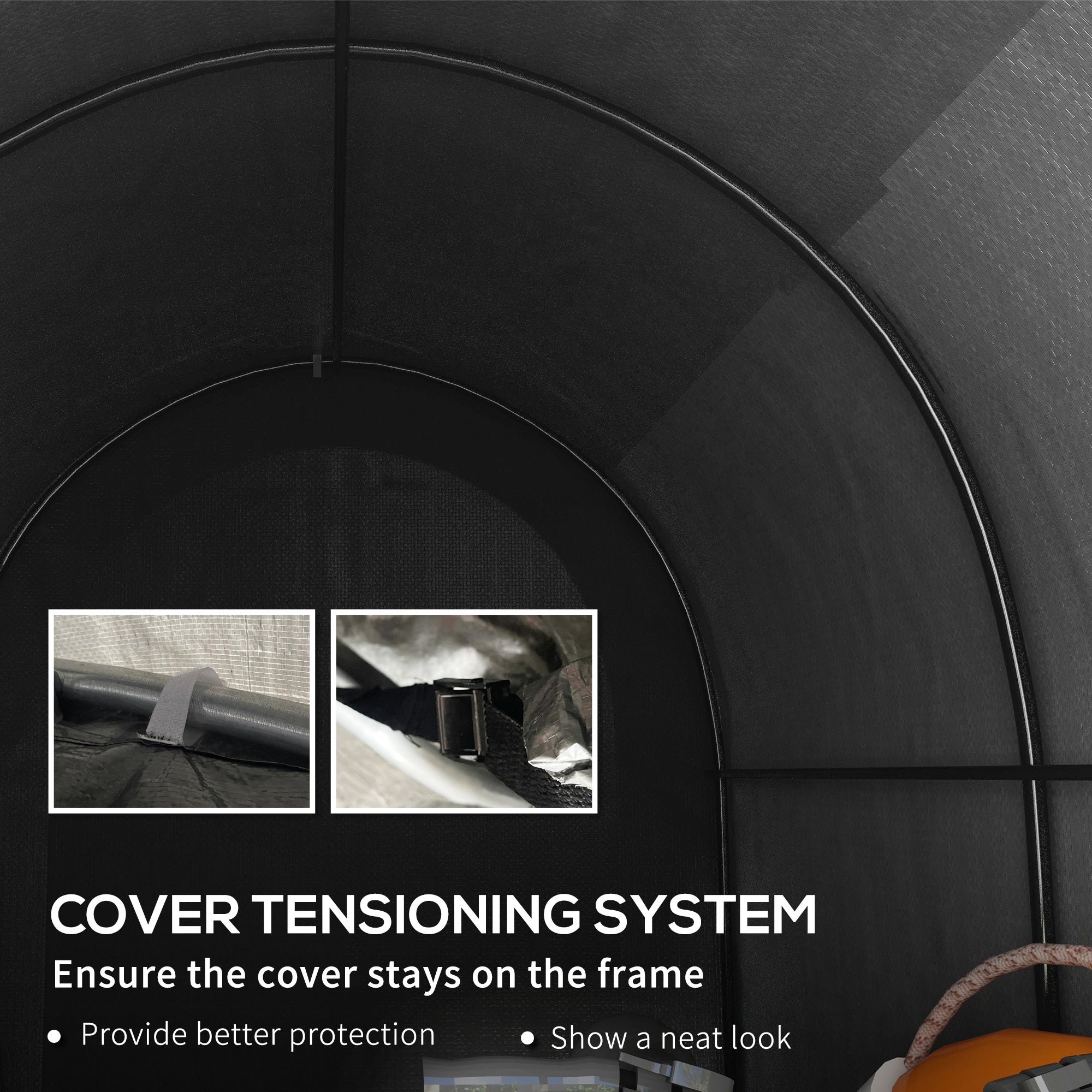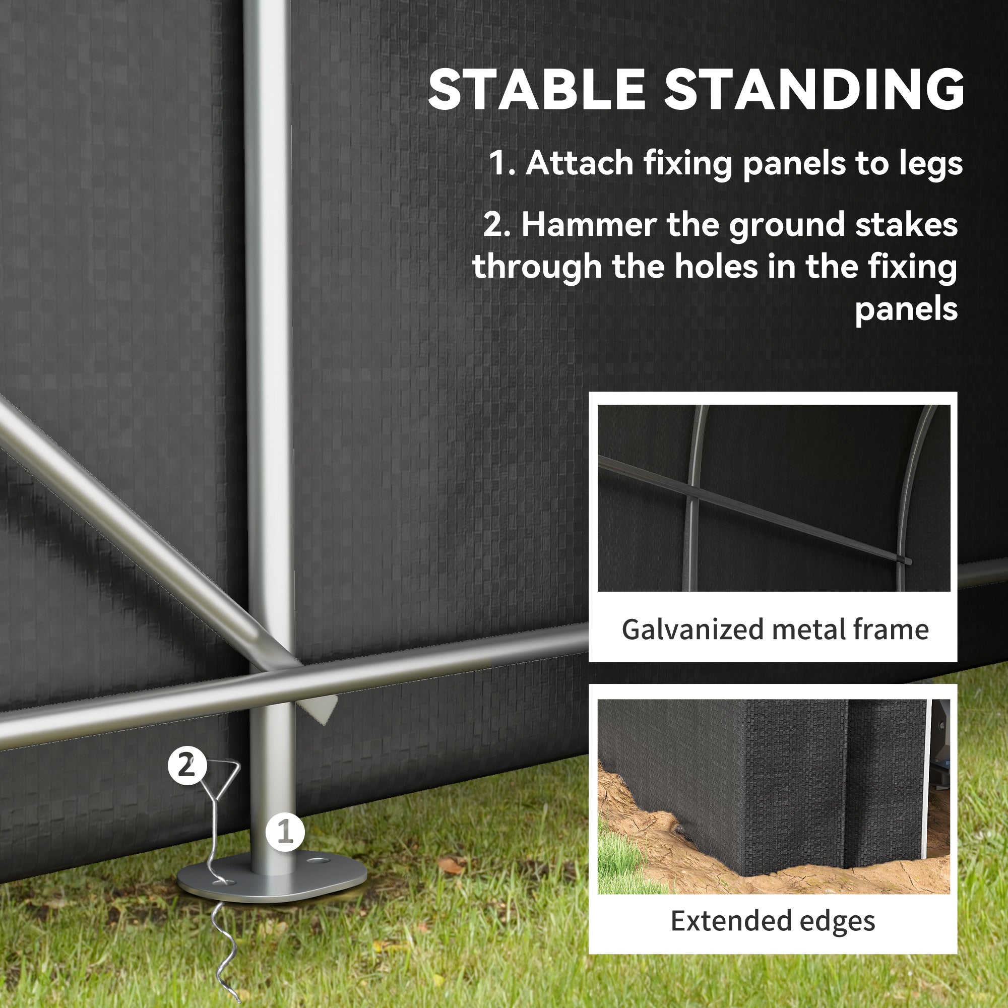 La structure en acier galvanisé robuste garantit solidité et stabilité par mauvais temps. La bâche épaisse en polyéthylène offre une excellente résistance aux intempéries et assure une étanchéité accrue grâce aux bords prolongés pouvant être enterrés. Le système de tension à cliquet maintient la toile bien en place même par vent soutenu.