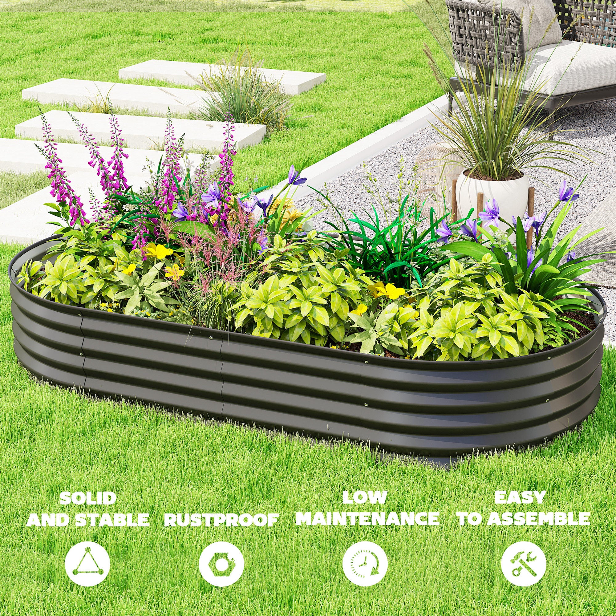 Conçu en acier galvanisé, ce bac résiste très bien aux conditions extérieures et conserve sa solidité au fil des saisons. Le joint en caoutchouc sur le bord supérieur améliore la sécurité en réduisant les arêtes vives lors de la manipulation.
