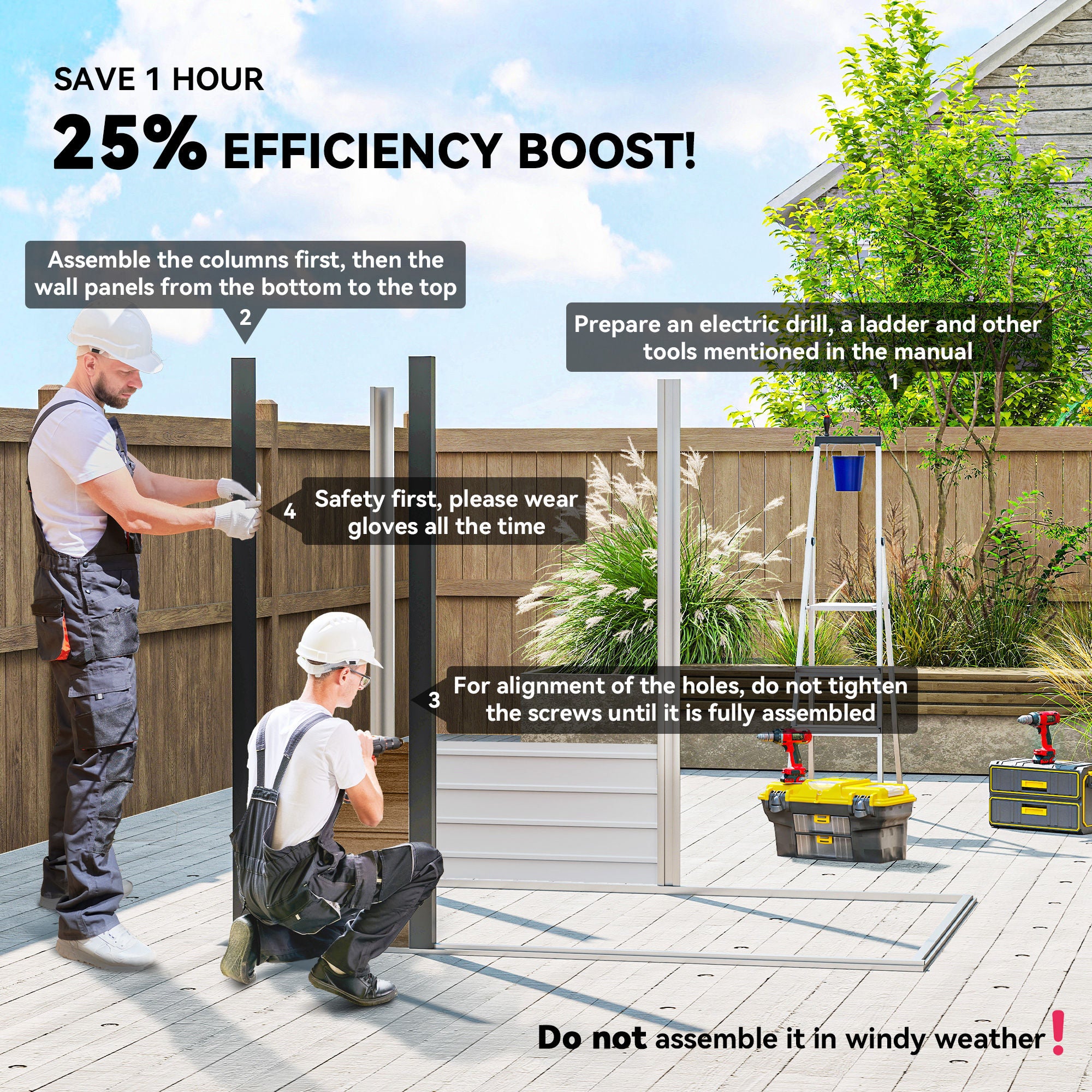 - Contient : 1 abri de jardin, 1 paire de gants, 1 mode d’emploi