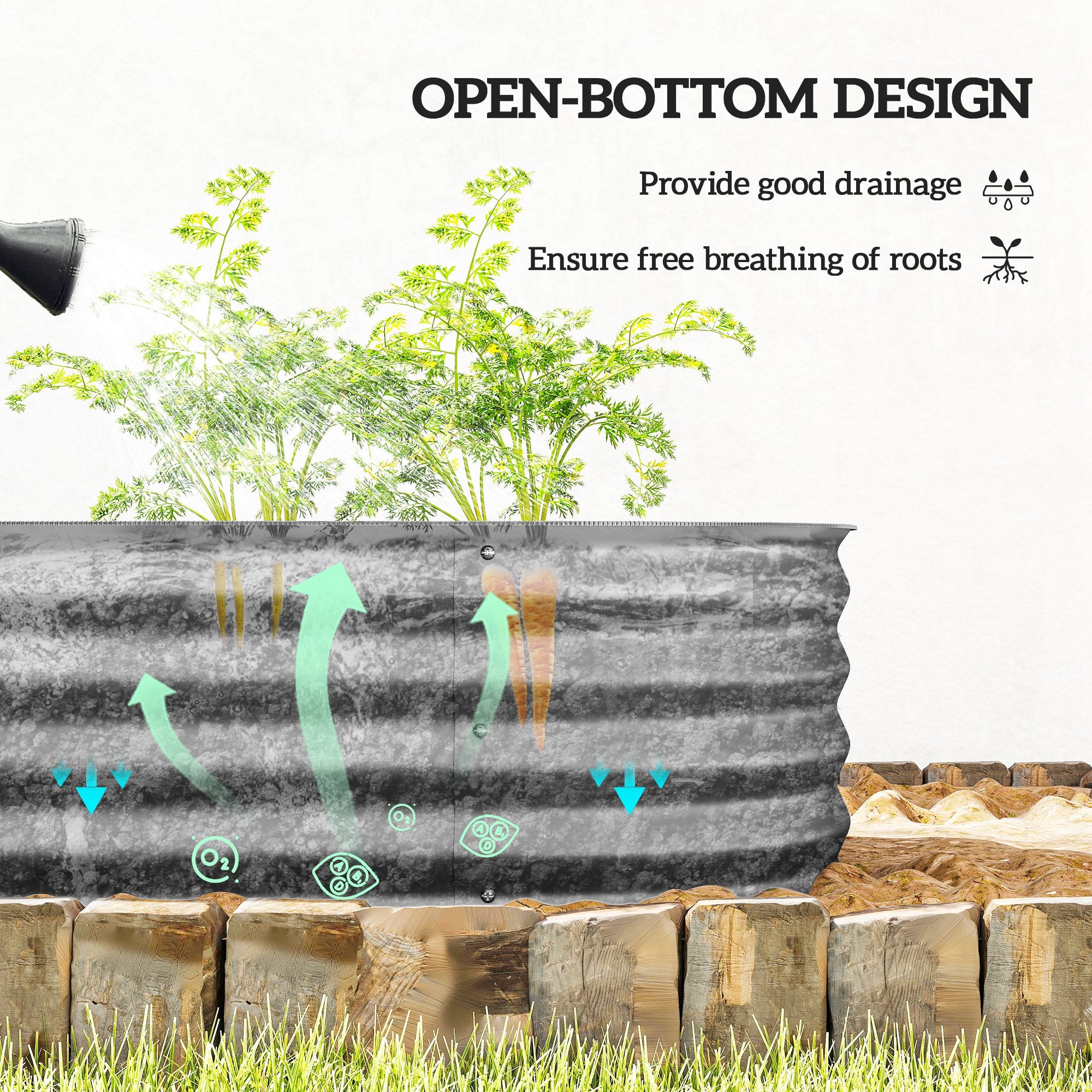 Grâce à ses parois extra-profondes, ce bac convient parfaitement aux légumes et plantes à racines profondes. Son fond ouvert empêche l’accumulation d’eau, favorise un drainage naturel et limite la pousse des mauvaises herbes pour une croissance saine et équilibrée.