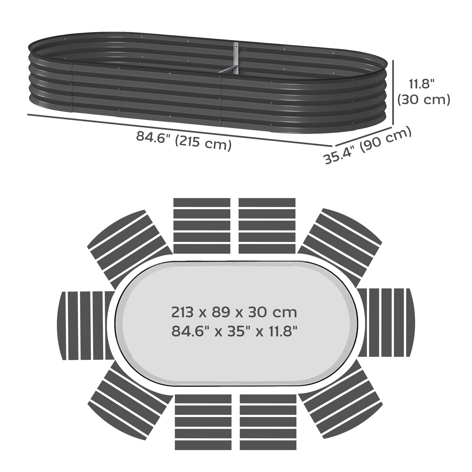 - Dimensions intérieures du pot : 83,9 po L x 35 po P x 11,8 po H (213 x 89 x 30 cm)