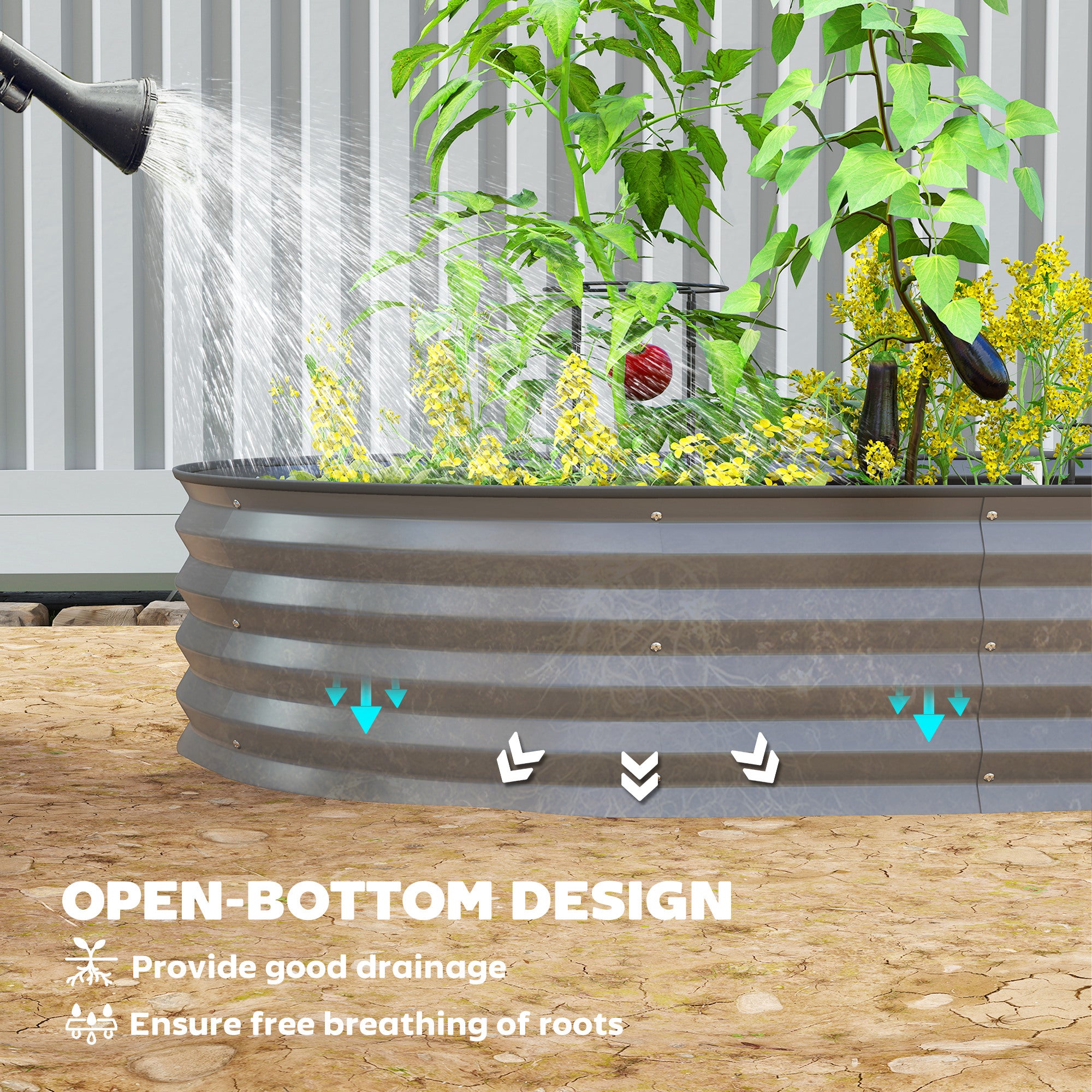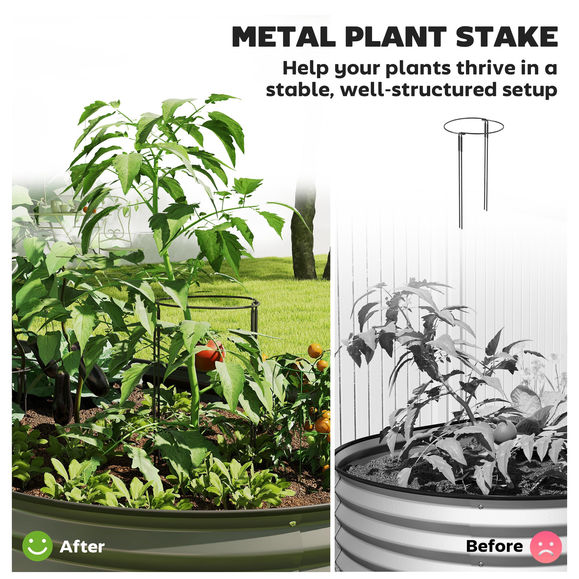 Grâce à son fond ouvert, ce bac permet aux racines de se développer librement dans le sol, favorisant une croissance saine des plantes. Le tuteur métallique inclus soutient efficacement les plantes plus hautes et accompagne leur développement, ce qui en fait un choix idéal pour une grande variété de cultures.