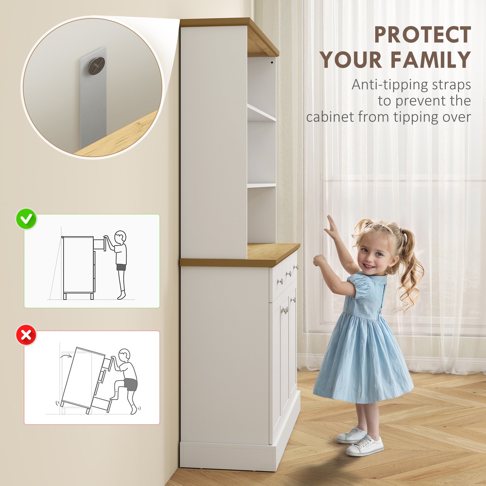 Montage et entretien : Son large comptoir ouvert offre une installation facile pour vos appareils électroménagers. Le meuble est équipé d’un système anti-basculement pour une utilisation sécuritaire. L’assemblage est simple et les surfaces lisses permettent un entretien rapide.