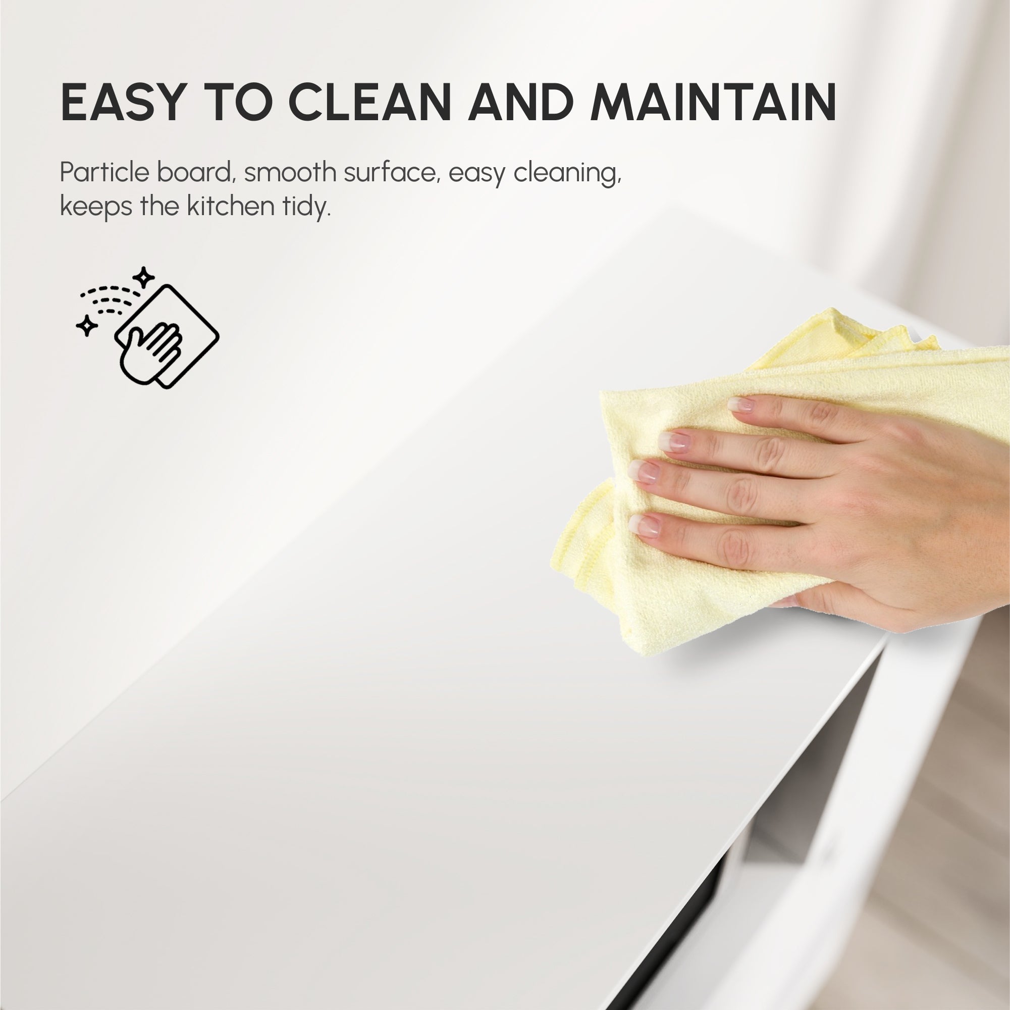 Solidité et entretien facile : conçu en panneaux de particules robustes, ce meuble offre une excellente durabilité tout en étant facile à nettoyer au quotidien. Son plateau supérieur stable peut accueillir de petits appareils électroménagers ou des éléments décoratifs.