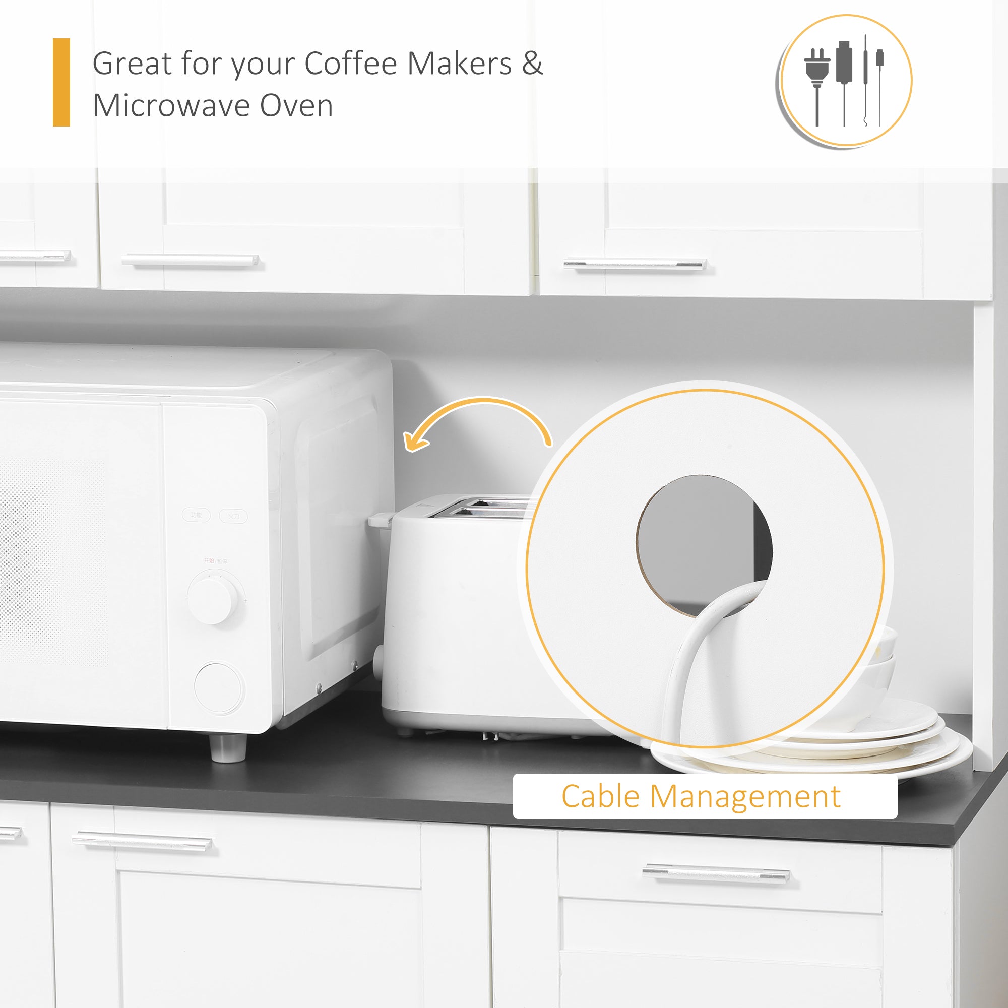 Espace fonctionnel : Doté d’un grand plan de travail ouvert avec trou pour le passage des câbles, ce meuble est parfait pour installer votre micro-ondes, grille-pain ou cafetière. Ses armoires à portes multiples et ses étagères ajustables offrent une flexibilité optimale pour ranger vaisselle, poêles, produits secs et électroménagers.