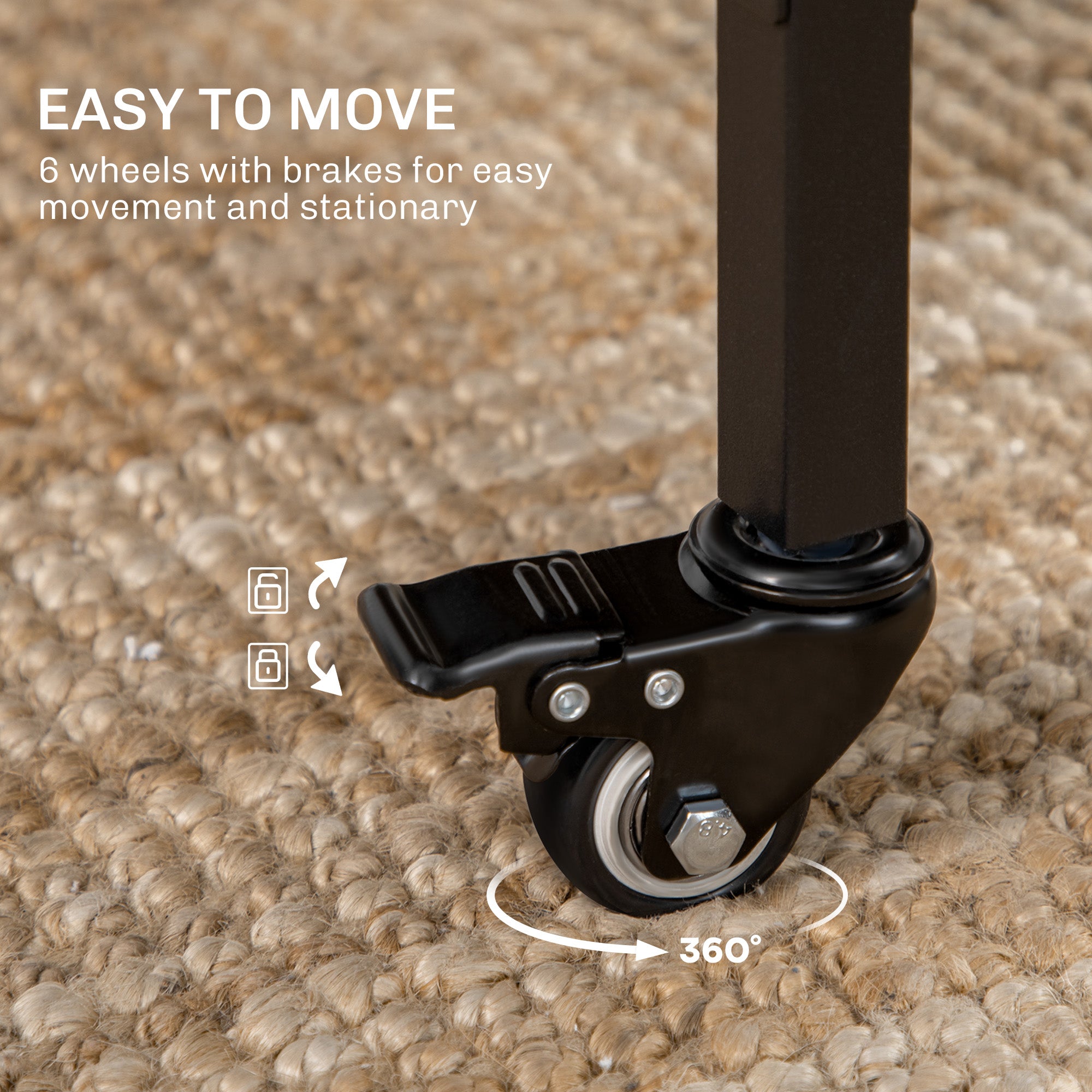 Ses deux panneaux latéraux relevables permettent d’agrandir la surface selon vos besoins, puis de la replier pour un rangement compact. Une étagère centrale dissimulée garde vos essentiels bien organisés et à portée de main. Les 6 roulettes pivotantes assurent un déplacement fluide, tandis que les freins garantissent une excellente stabilité une fois la table en place.