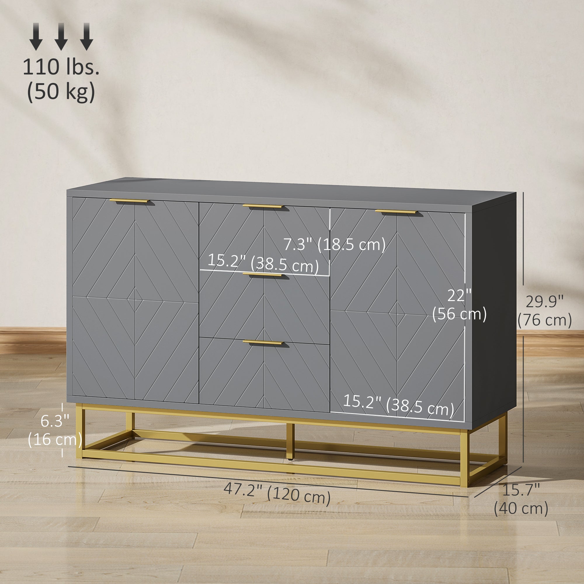 Buffet gris avec 3 tiroirs et 2 portes – Design chic avec détails dorés