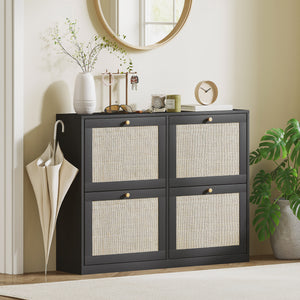 - Design Boho Chic : Ce meuble à chaussures pour entrée combine une finition noire élégante avec des façades en rotin naturel et des boutons argentés élégants, rehaussant la décoration de votre maison avec une touche d'élégance
