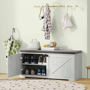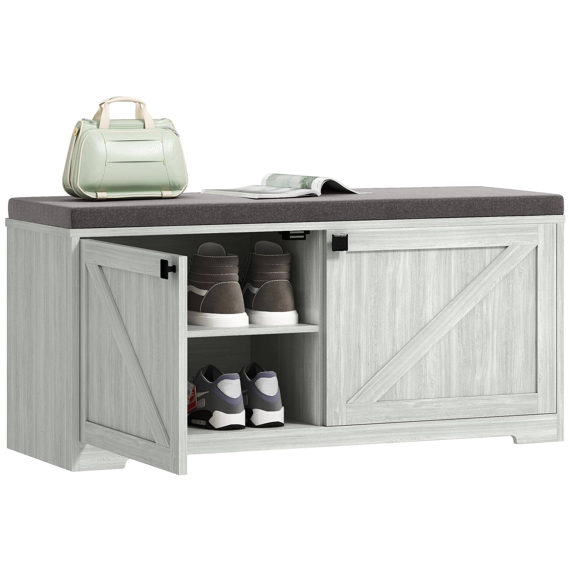 - Élégance de la ferme : Fabriqué dans un style de ferme, avec un effet bois, de charmantes portes de grange doubles et une ligne de plinthe, ce banc de rangement ajoute une touche de charme rustique et une touche invitante à n'importe quelle entrée, chambre ou salon