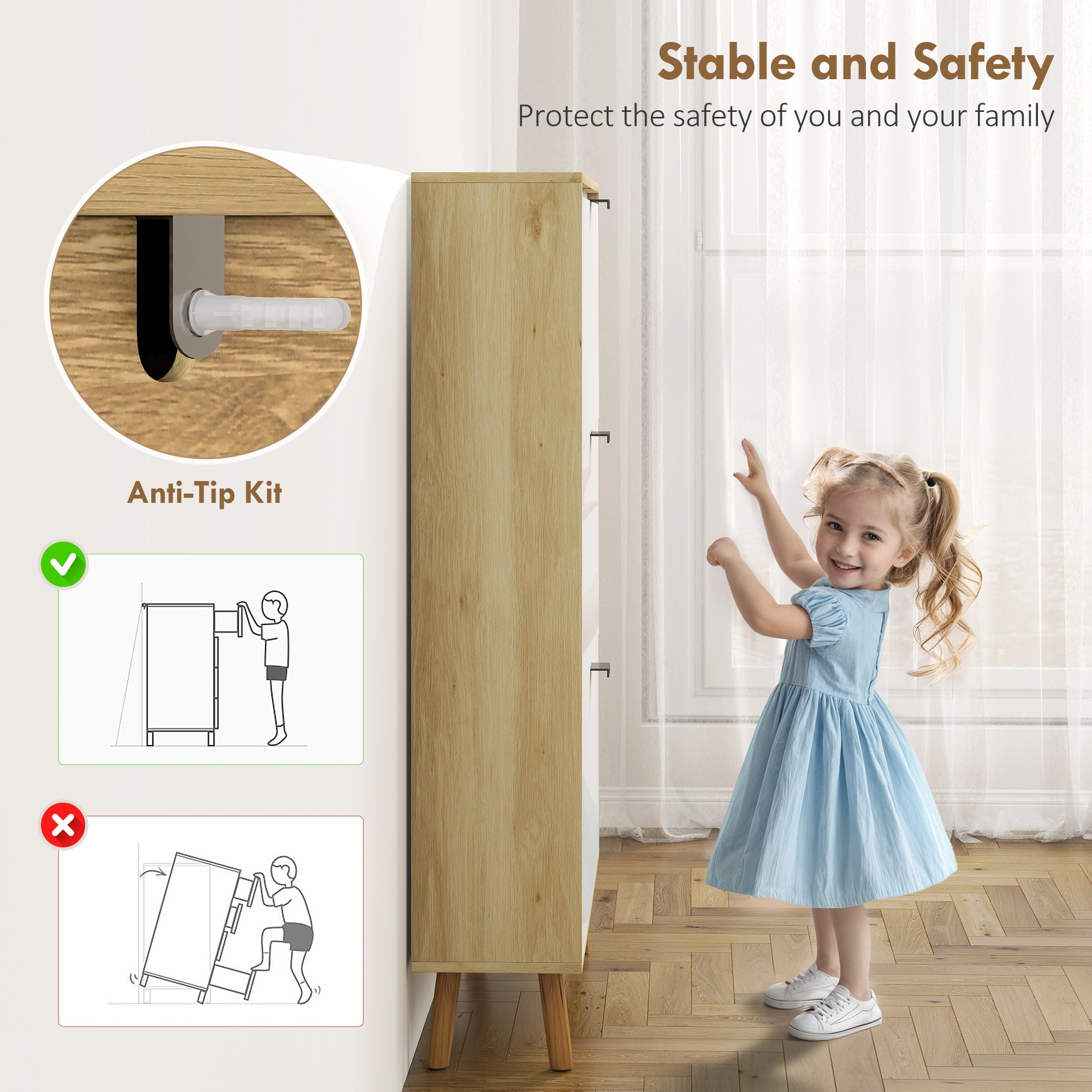 Sécurité et stabilité garanties : des pieds robustes et un dispositif anti-basculement assurent un usage fiable et durable.