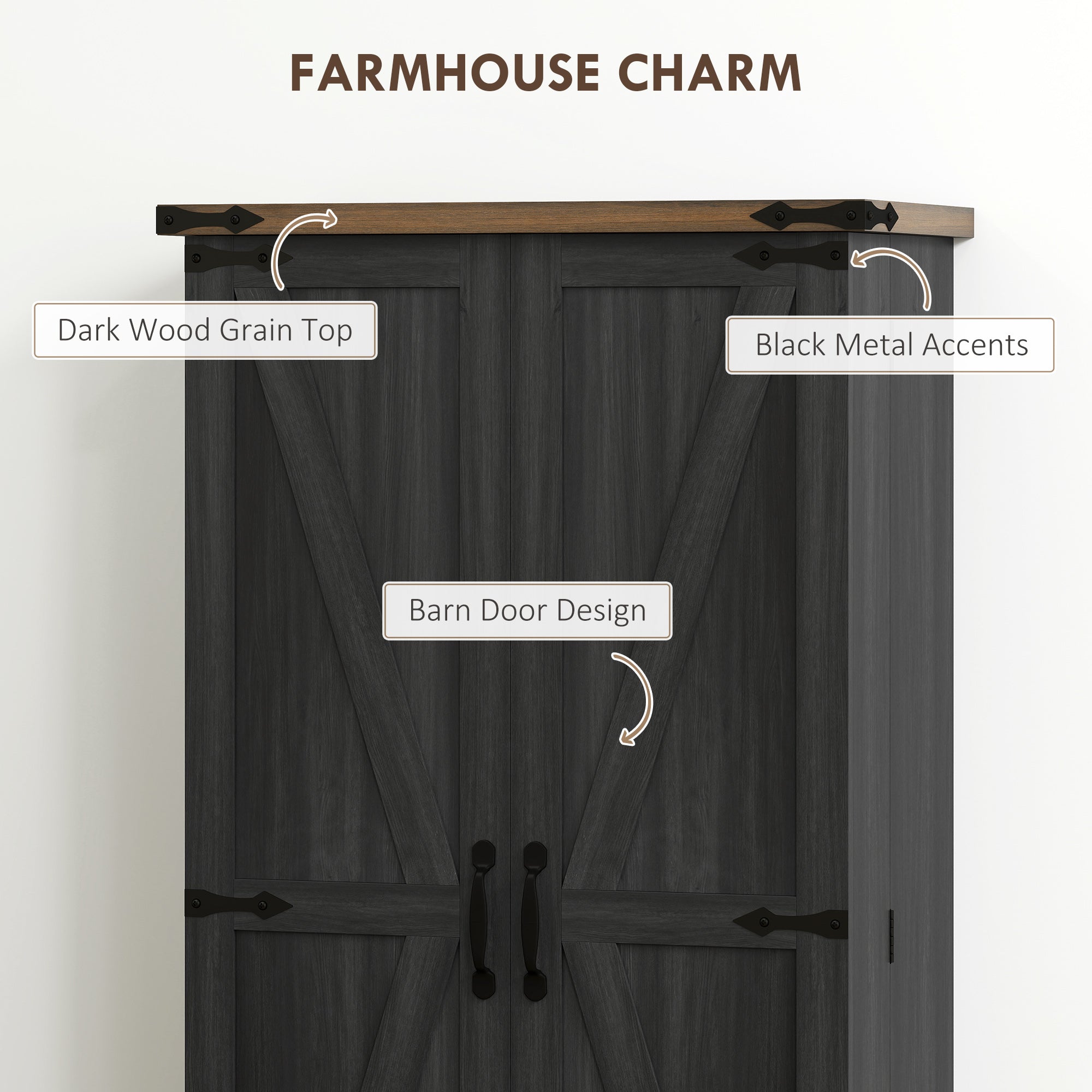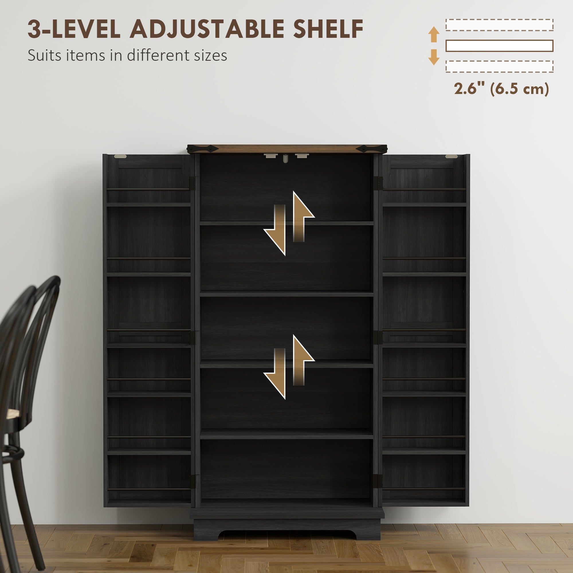 Buffet de cuisine noir – Armoire style porte de grange avec étagères réglables et design rustique