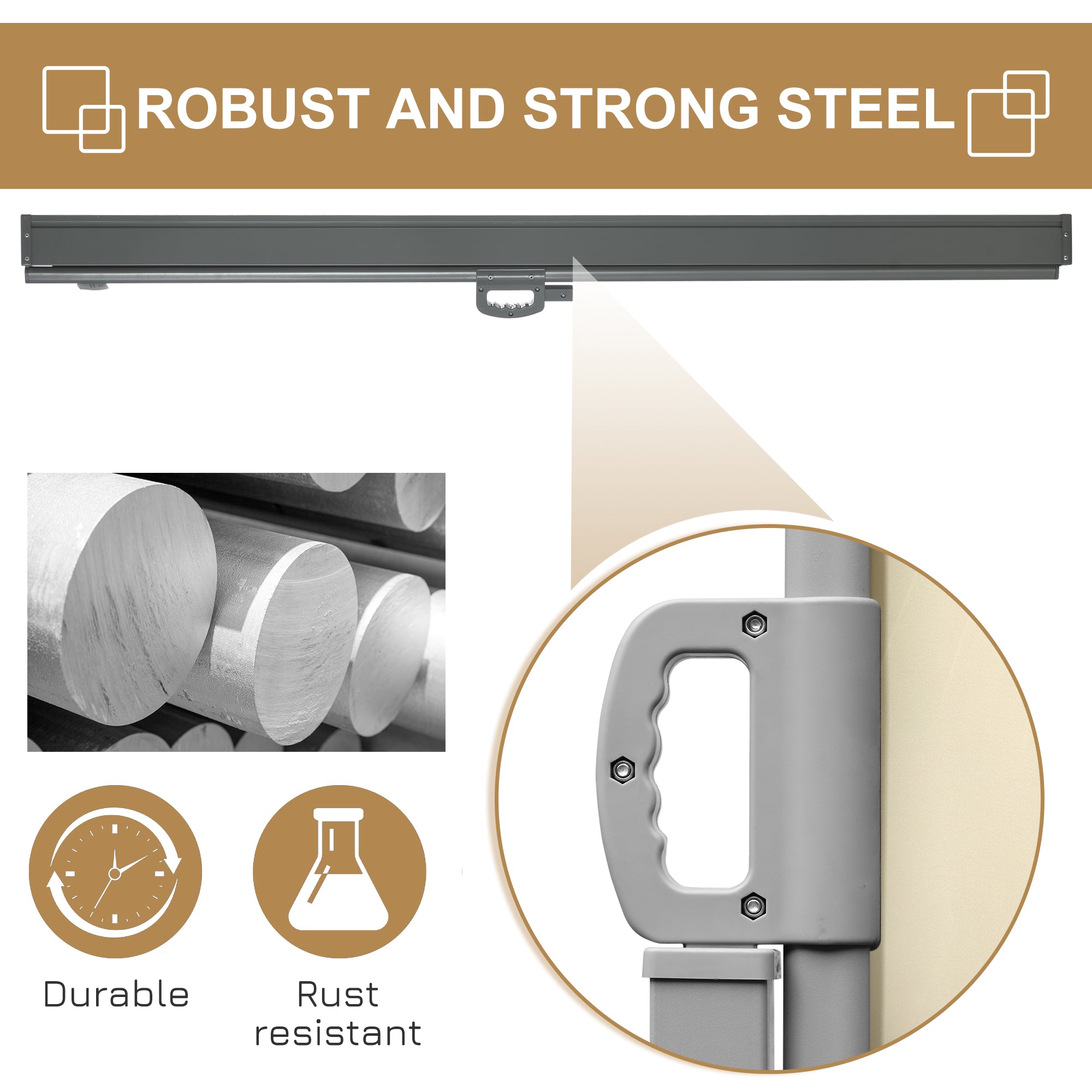 Sa structure en acier de haute qualité assure robustesse et durabilité. Le tissu en polyester avec revêtement PA est respirant, imperméable, résistant aux UV et facile à nettoyer, ce qui le rend parfaitement adapté à une utilisation intérieure et extérieure.