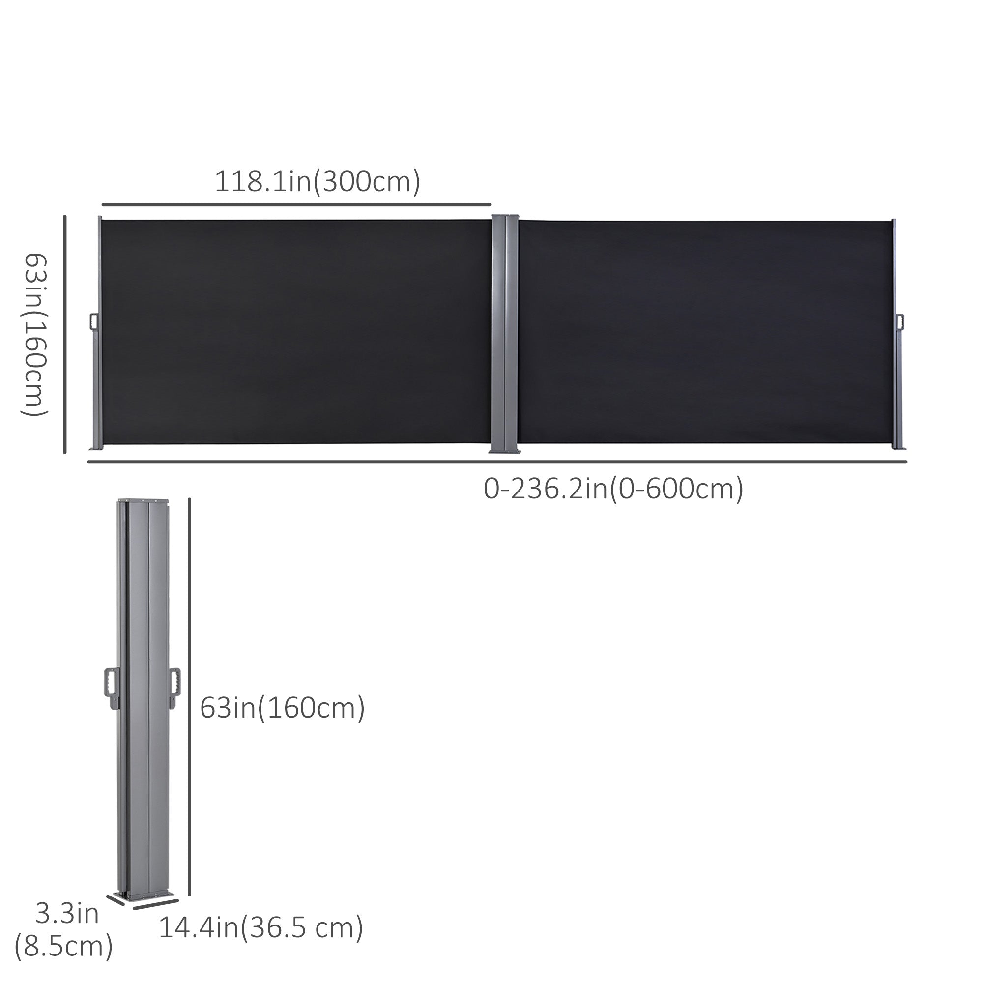 0–236,2 po (0–600 cm) écrans doubles - Dimensions pliées : 14,4 po L x 3,3 po l x 63 po H (36,5 x 8,5 x 160 cm)