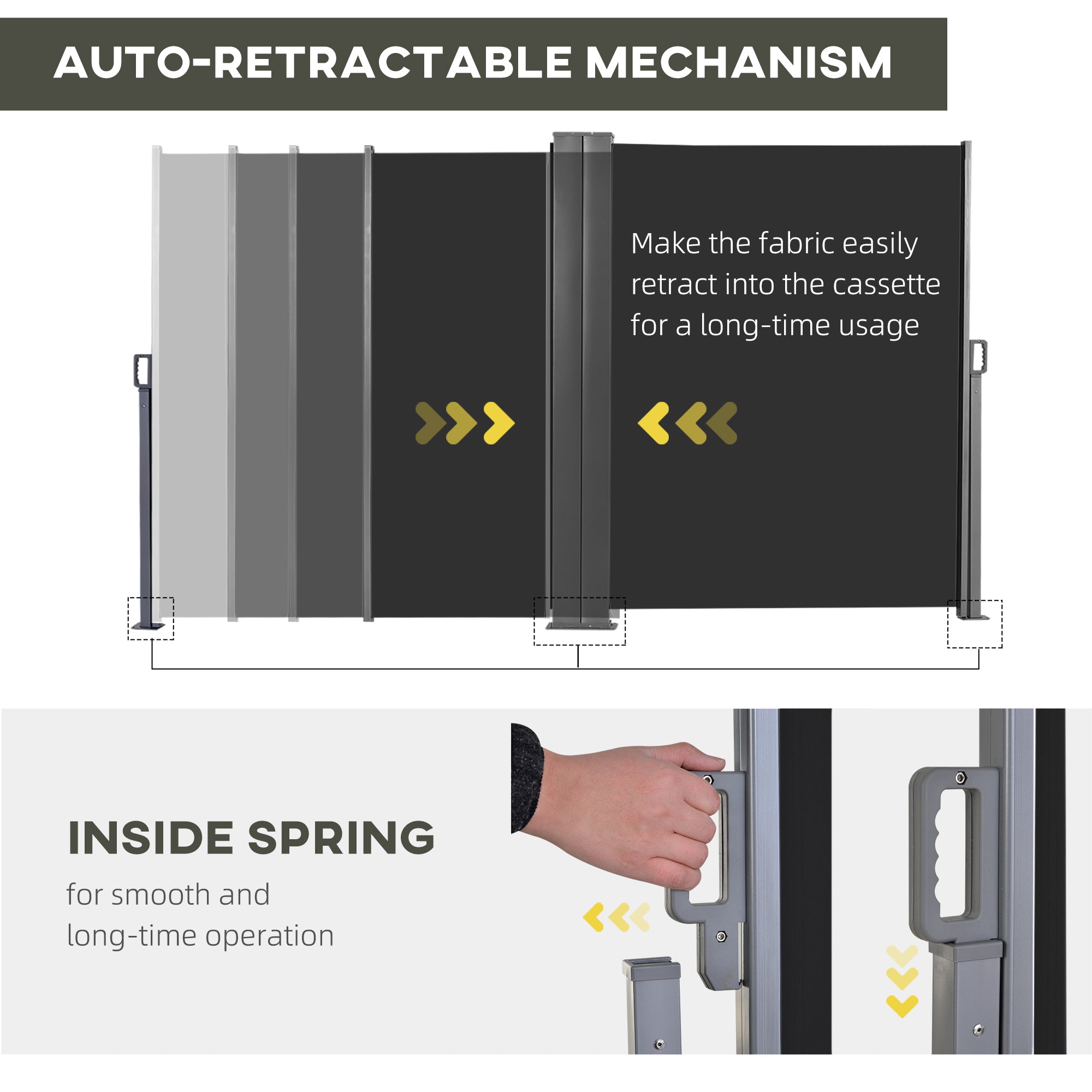 Grâce à sa conception à double paroi, ce brise-vue offre une grande flexibilité d’installation, quel que soit l’angle souhaité. Son mécanisme rétractable automatique avec poignée permet un déploiement simple et rapide, tandis que le réglage en angle et en longueur s’adapte parfaitement à vos besoins.