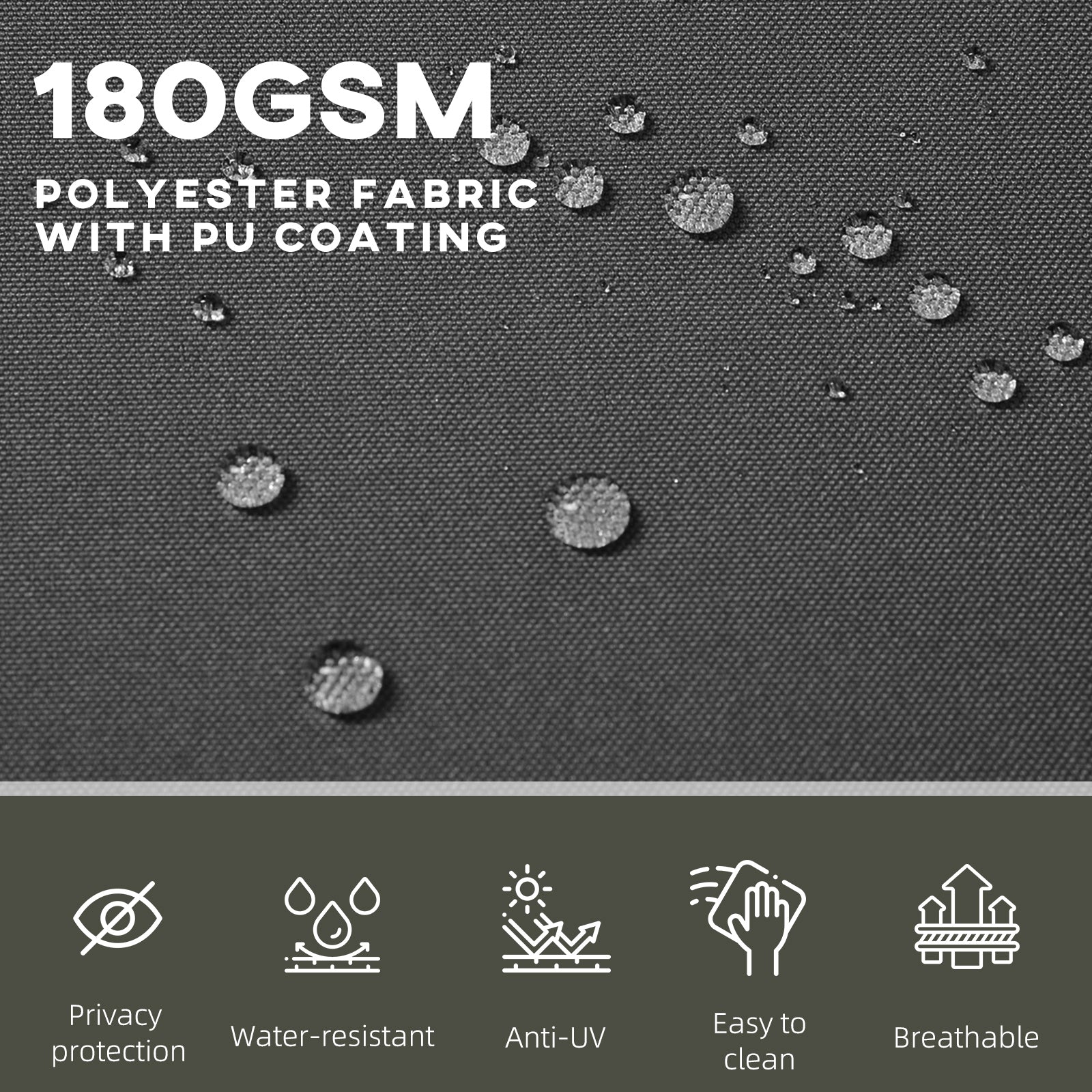 La structure entièrement métallique assure une excellente robustesse et une résistance accrue à la rouille. Le tissu en polyester 180 g/m² avec revêtement PA est résistant aux UV et à l’eau, garantissant une durabilité optimale pour une utilisation extérieure prolongée.