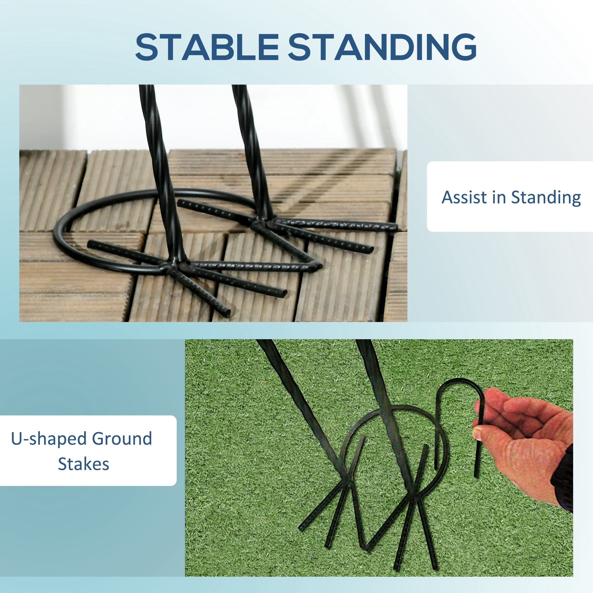Fabriquées en acier traité par électrophorèse et recouvert d’un revêtement en poudre, ces sculptures sont conçues pour résister aux intempéries et conserver leurs couleurs dans le temps. Leur base circulaire combinée à des piquets de sol en forme de U assure une excellente stabilité une fois installées.