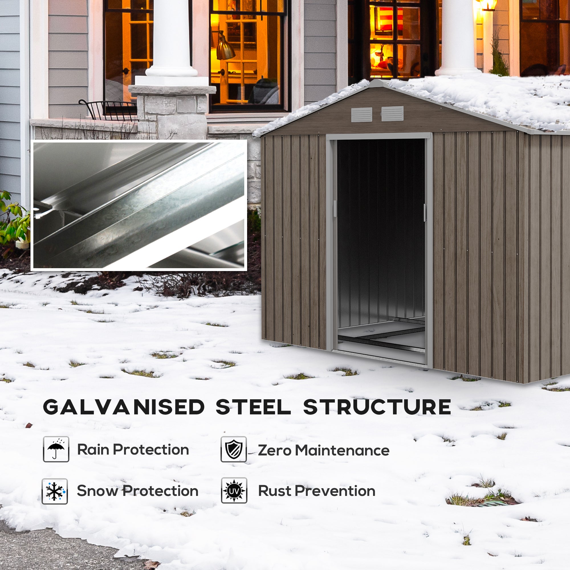Sa structure en acier galvanisé avec finition peinte assure une excellente résistance à la corrosion, à l’humidité et aux conditions extérieures difficiles. Le toit en pente empêche l’accumulation d’eau et de neige, tandis que les ouvertures d’aération favorisent une bonne circulation de l’air.