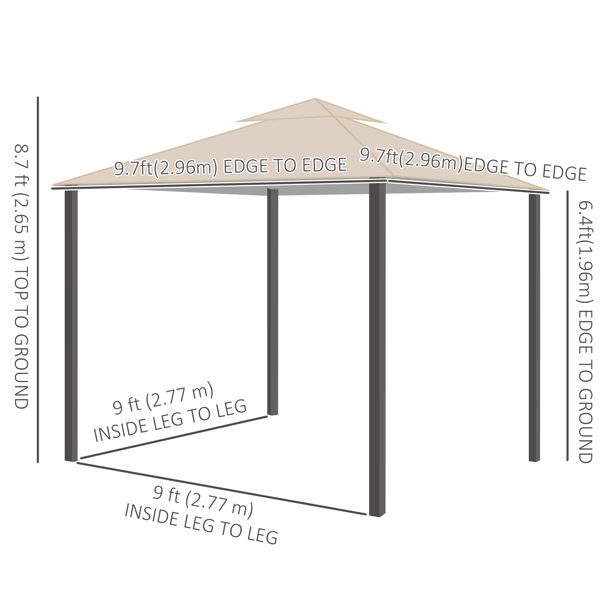 - Dimensions hors tout : 116,5 po L x 116,5 po l x 104,3 po H (296 x 296 x 265 cm)