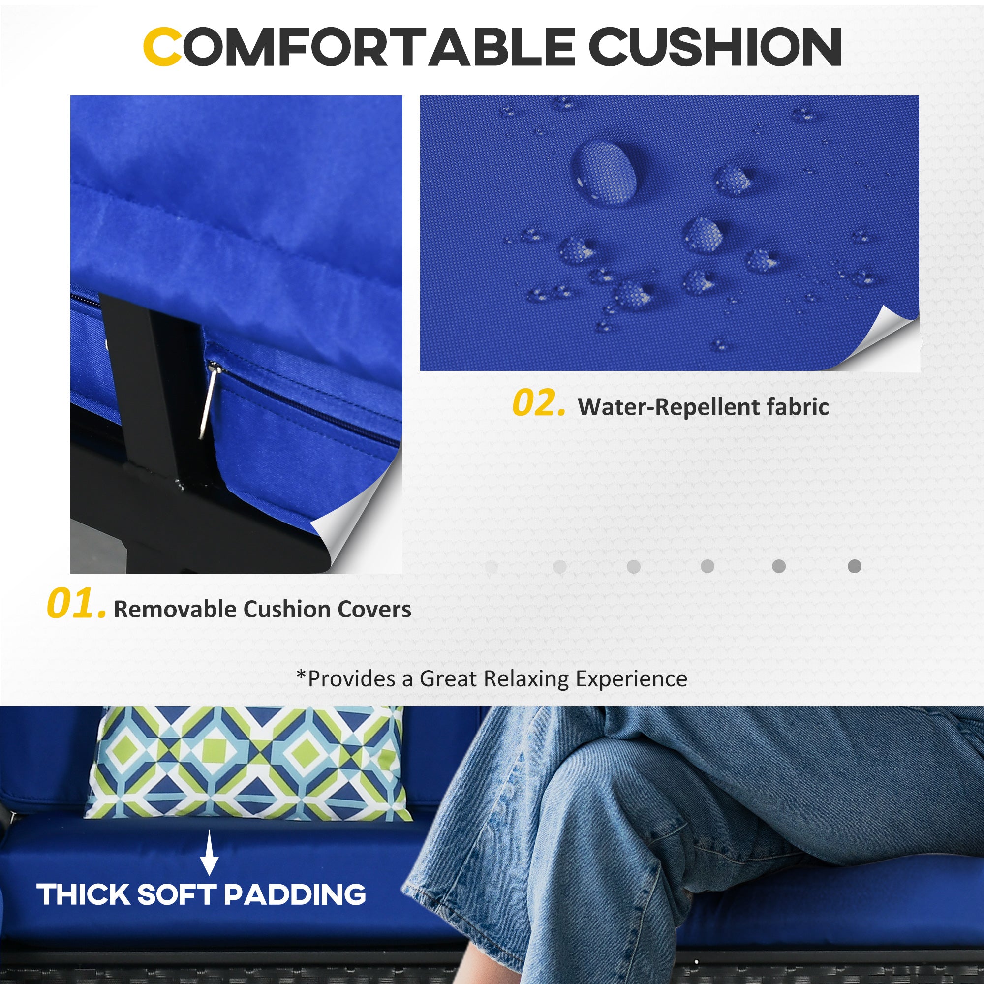 Matériaux de qualité : La structure en acier avec revêtement en poudre assure solidité et durabilité, tandis que la résine tressée PE résiste aux intempéries et demande peu d’entretien. Le tissu polyester déperlant et résistant aux UV protège efficacement les coussins et l’auvent, tout en conservant une belle tenue dans le temps.