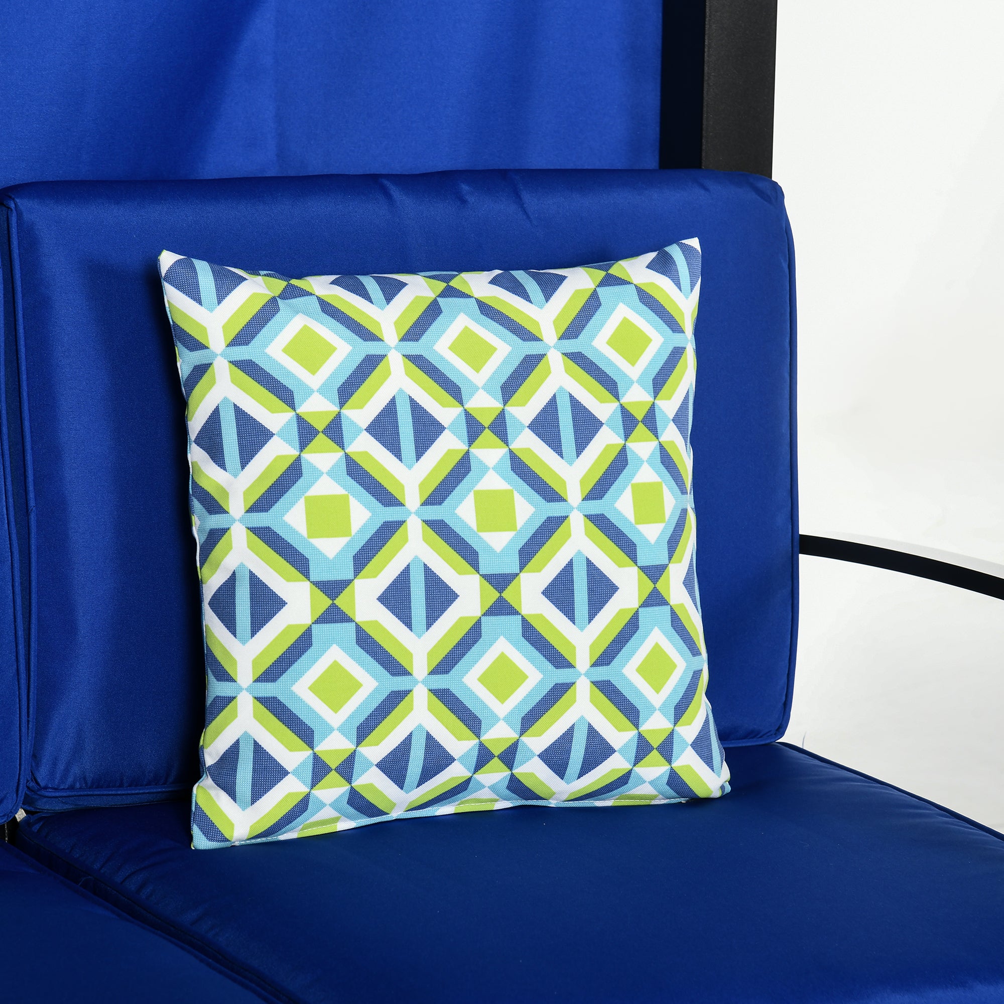 - Couleur : Cadre noir, tissu bleu, coussins blanc et vert