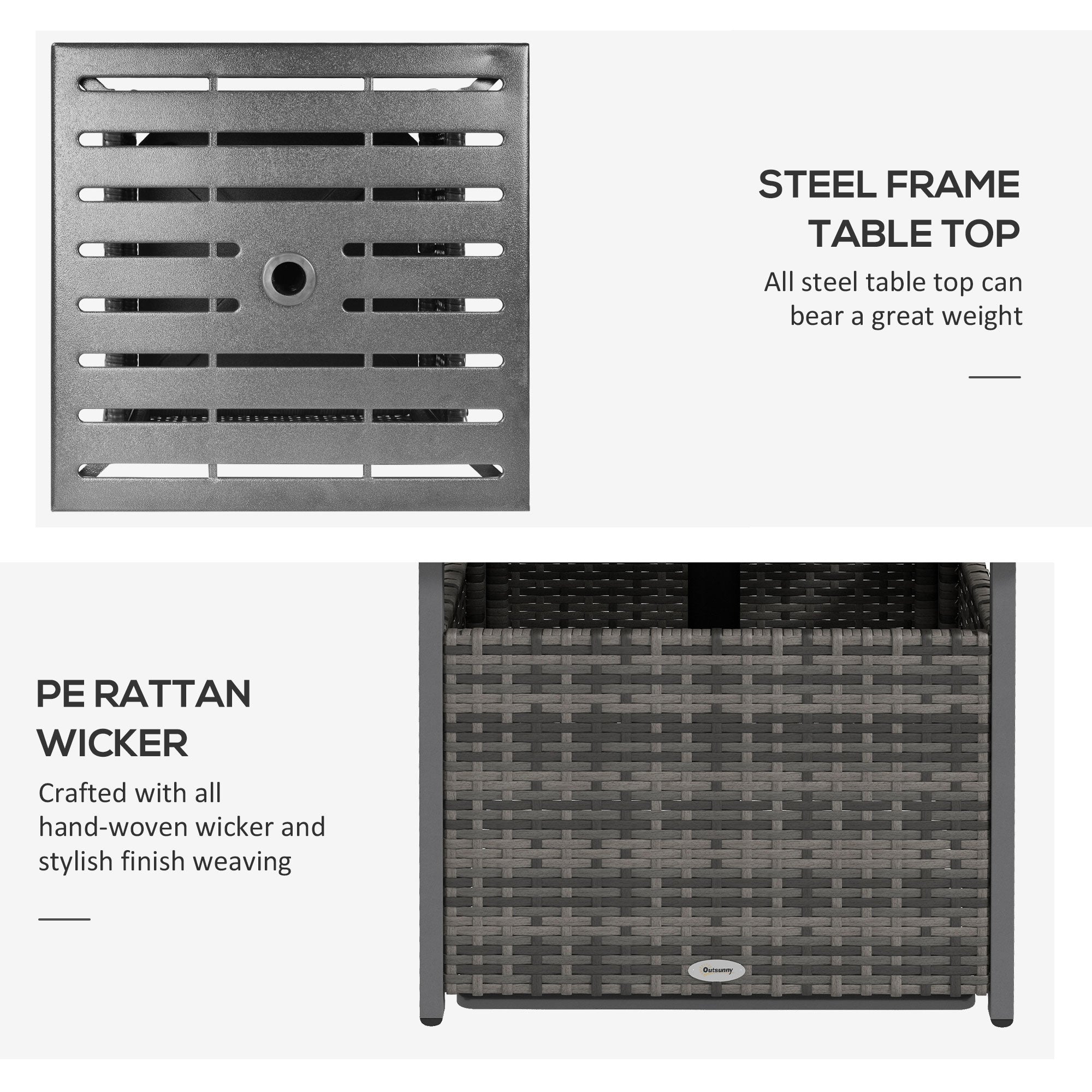Conçue avec une structure en acier thermolaqué, cette table assure solidité et stabilité. Le rotin PE est résistant aux intempéries et conçu pour supporter une utilisation extérieure prolongée, tandis que le plateau en acier est imperméable, résistant aux taches et facile à nettoyer.