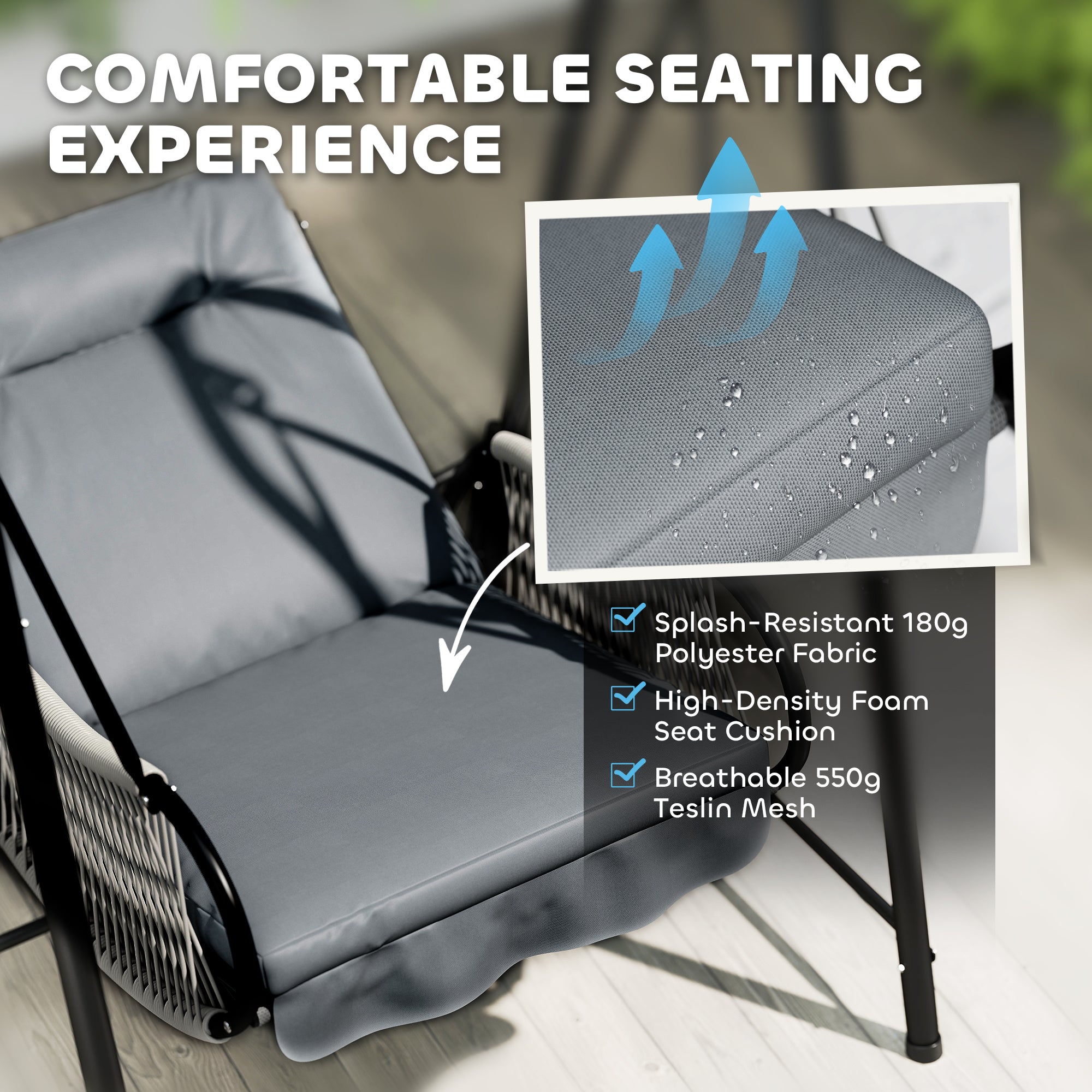 Transformez votre espace extérieur en véritable havre de paix grâce à cette balancelle élégante. Son coussin en mousse haute densité offre un confort exceptionnel, tandis que le tissu respirant en maille Teslin 550 g/m² assure une assise agréable même par temps chaud. Les détails en résine tressée PE apportent une touche moderne et raffinée à votre jardin, terrasse ou balcon.