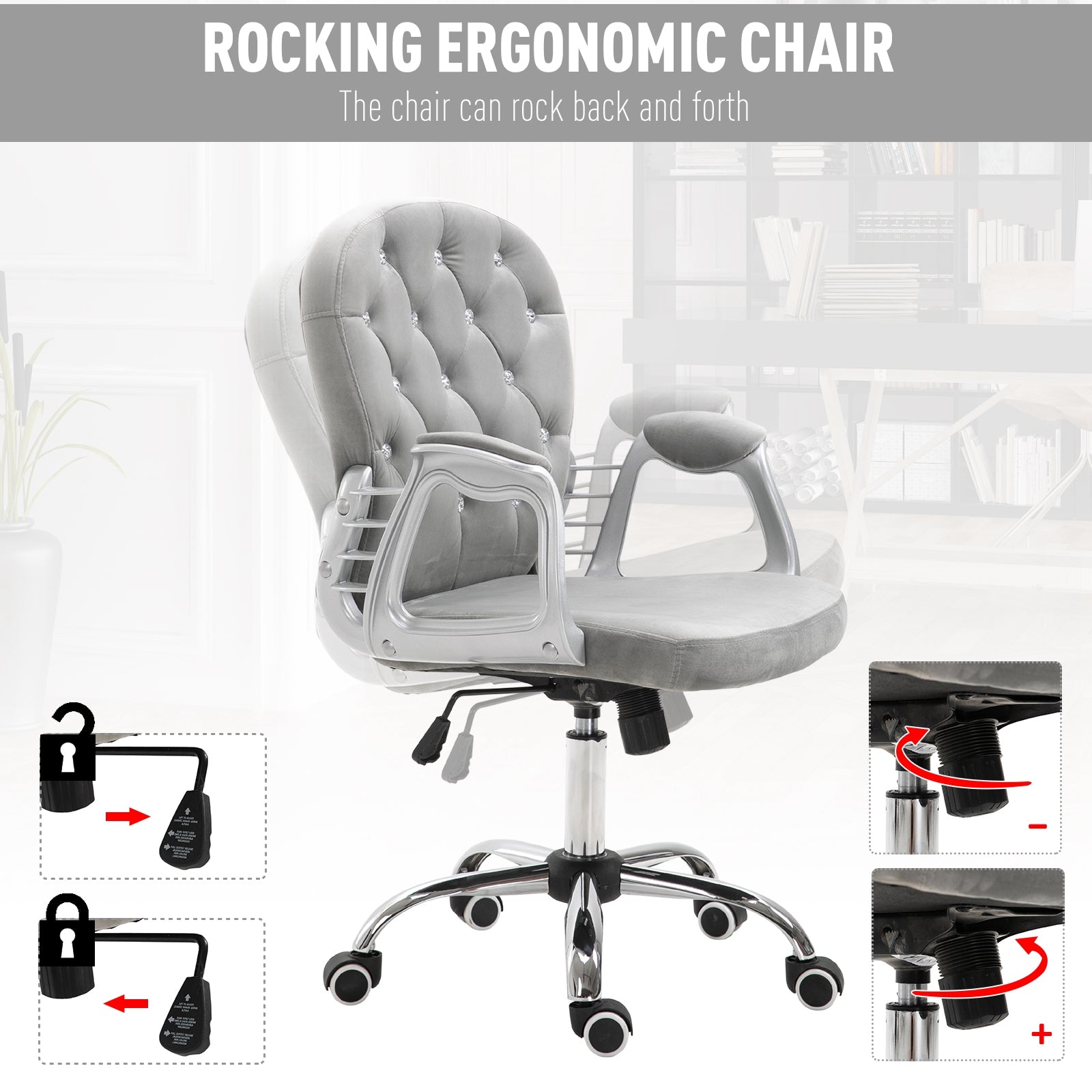 Confort et design : Alliez élégance et confort avec ce fauteuil de bureau capitonné en similicuir gris. Son dossier orné de cristaux décoratifs et son revêtement raffiné ajoutent une touche de sophistication à tout espace de travail. Le rembourrage épais de l’assise et du dossier assure un soutien agréable et un confort durable, idéal pour les longues heures de travail.