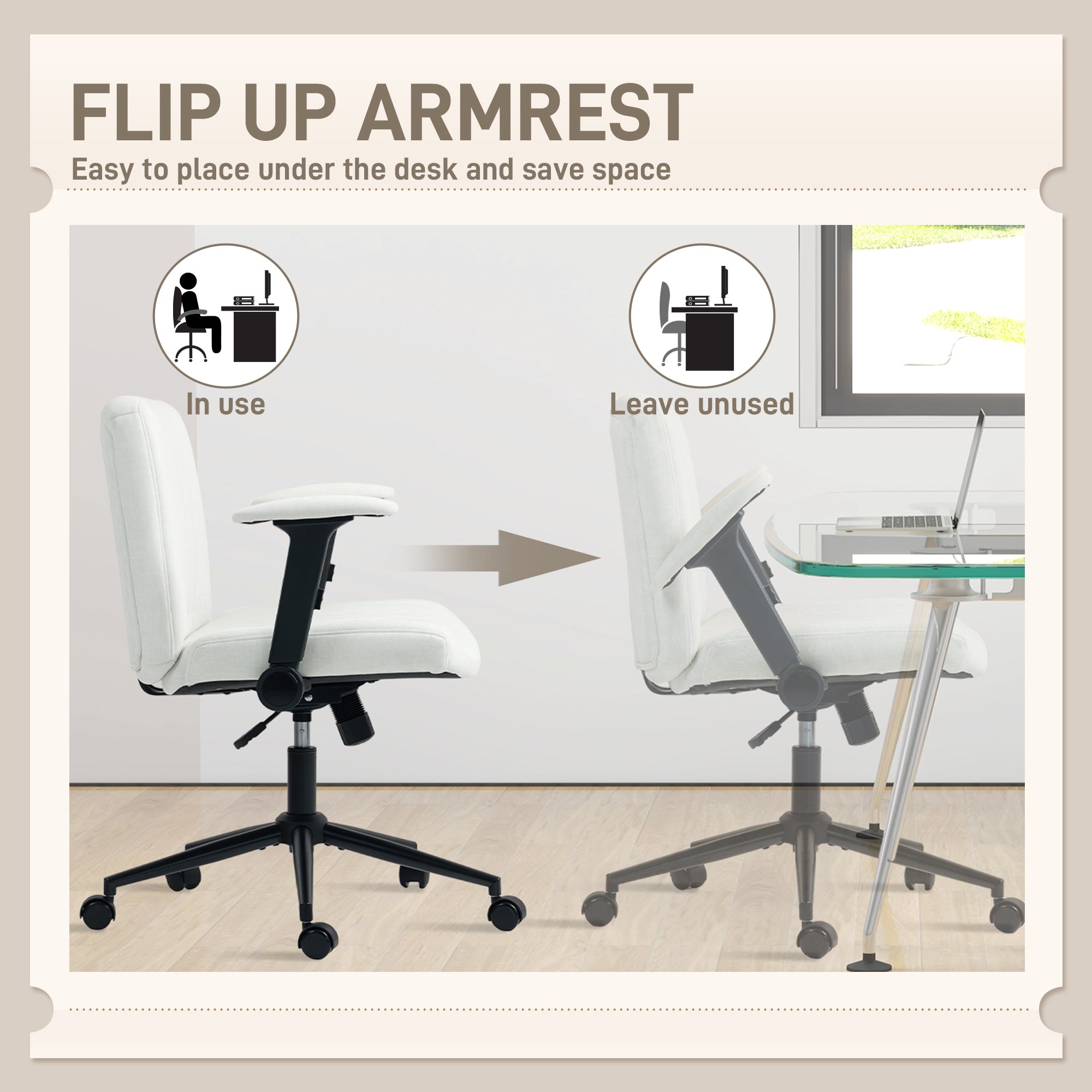 Fauteuil de bureau ergonomique en velours avec assise croisée et accoudoirs relevables – Blanc crème