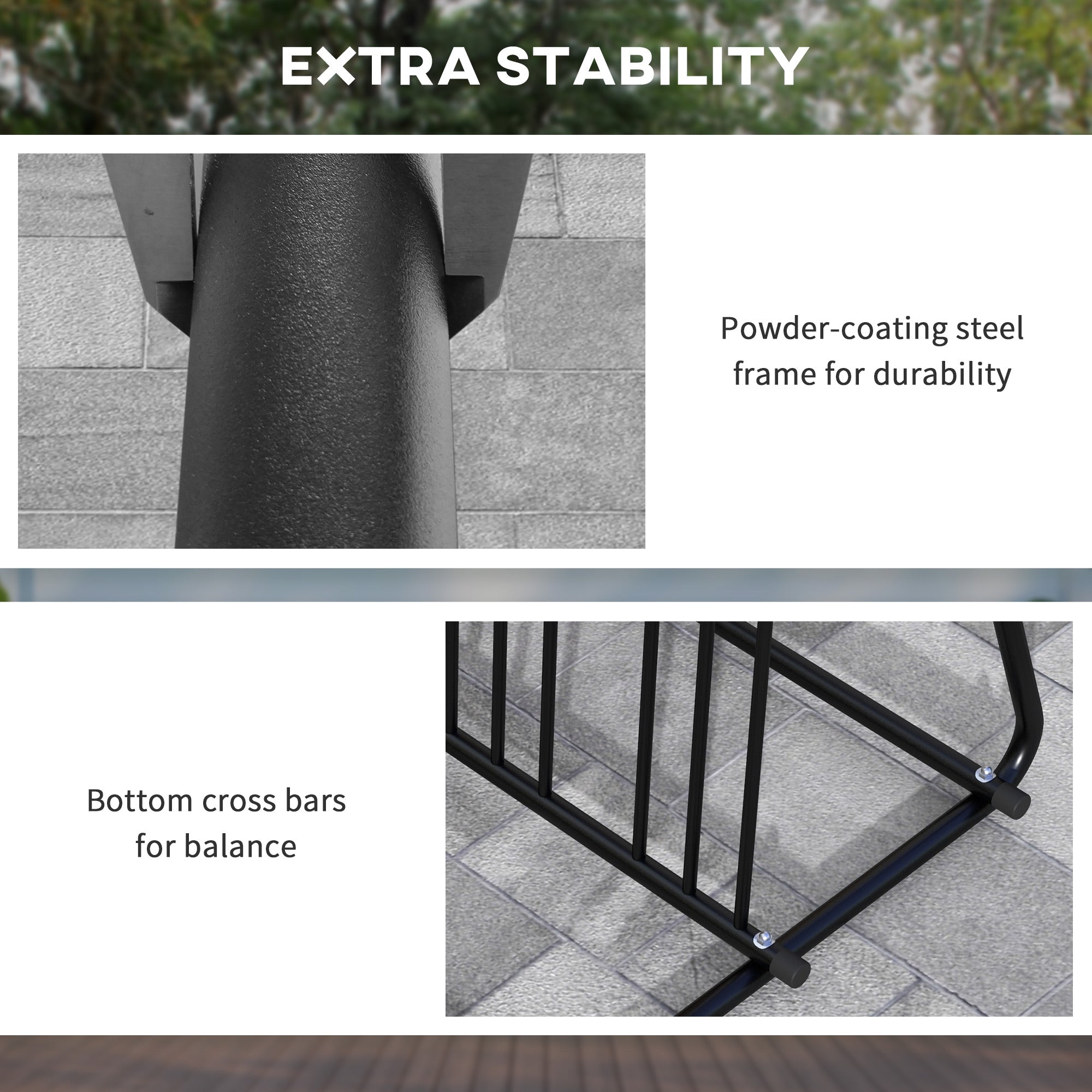 Fabriqué en acier robuste avec une finition thermolaquée résistante, il est conçu pour durer et supporter une utilisation extérieure. Les barres transversales inférieures assurent une excellente stabilité, tandis que les barres verticales maintiennent un espacement adéquat entre les vélos.