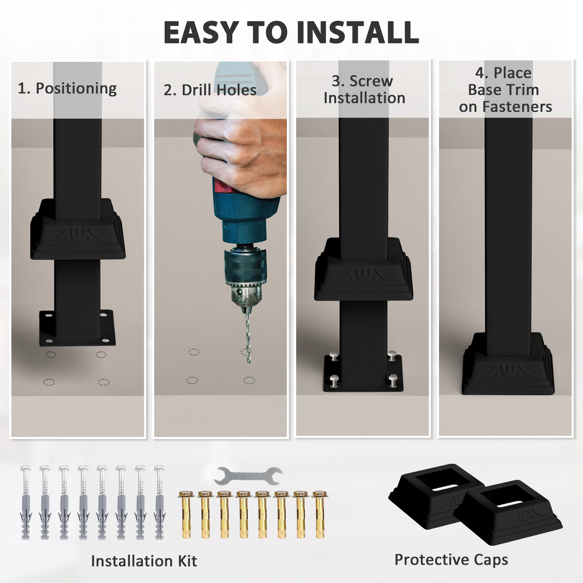- Contient : 1 rambarde de marche, 1 clé, 8 vis d’expansion, 8 vis autotaraudeuses, 4 vis, 4 écrous à vis, 2 bouchons décoratifs, 1 mode d'emploi