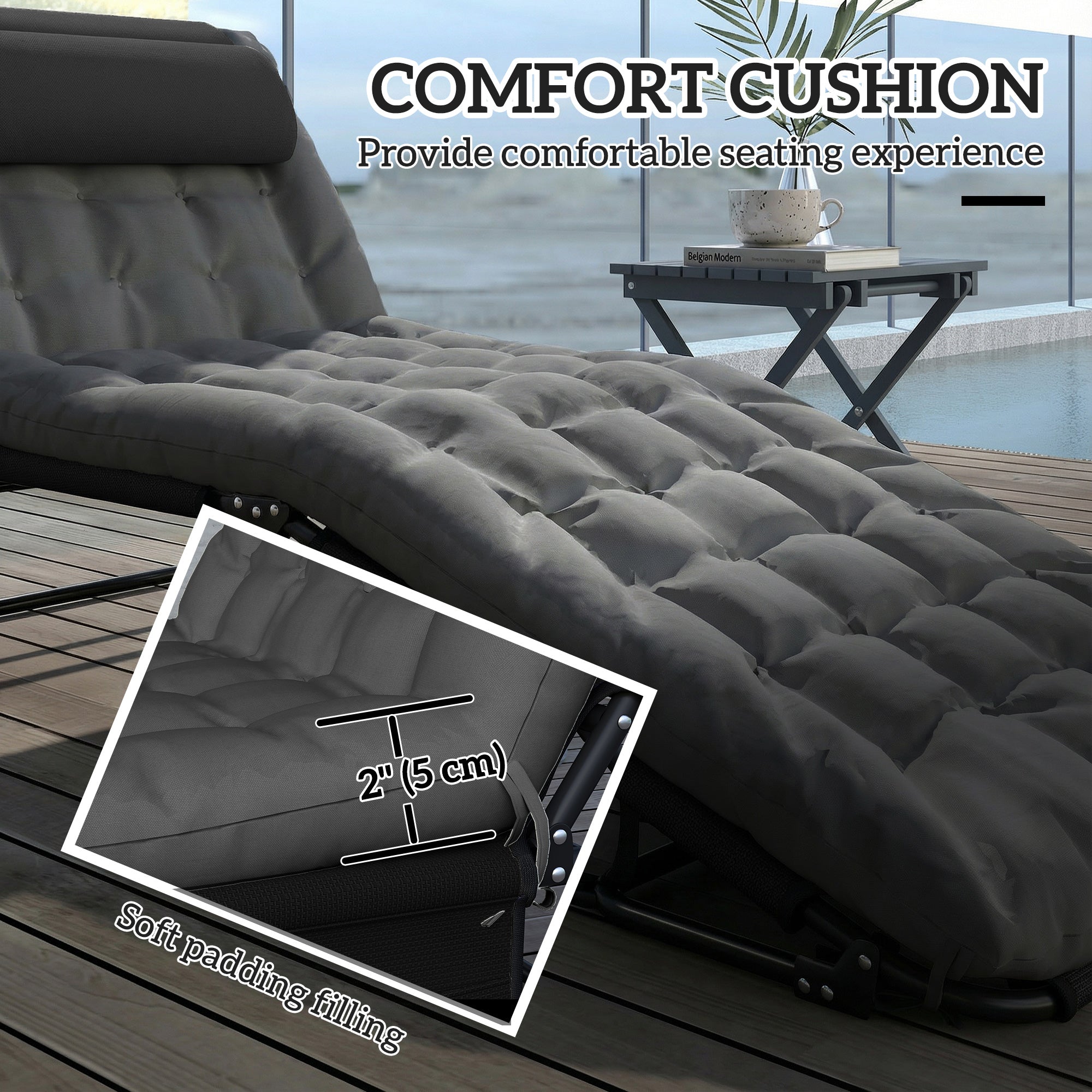 Profitez du confort d’un hôtel où que vous soyez grâce à cette chaise longue pliable conçue pour la détente. Son dossier inclinable sur quatre positions vous permet de trouver l’angle parfait pour bronzer ou relaxer. L’appui-tête intégré et le coussin moelleux offrent un soutien supplémentaire pour un confort optimal en plein air.